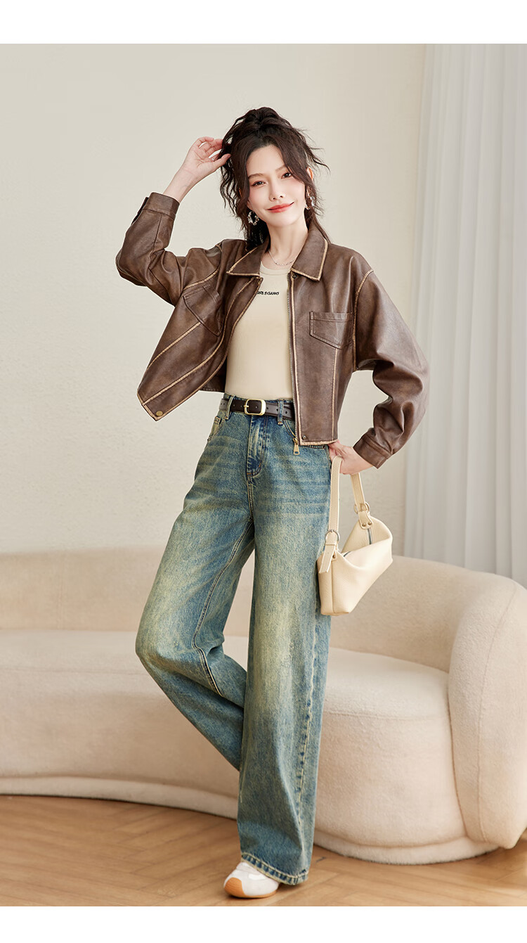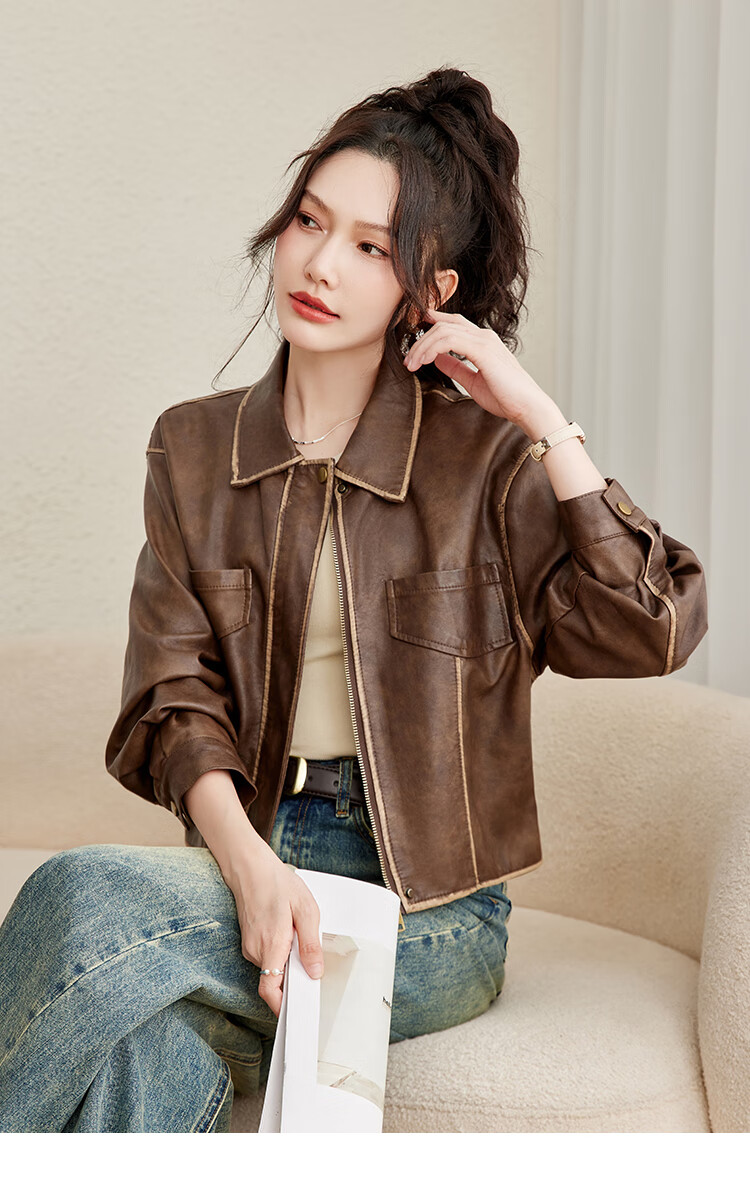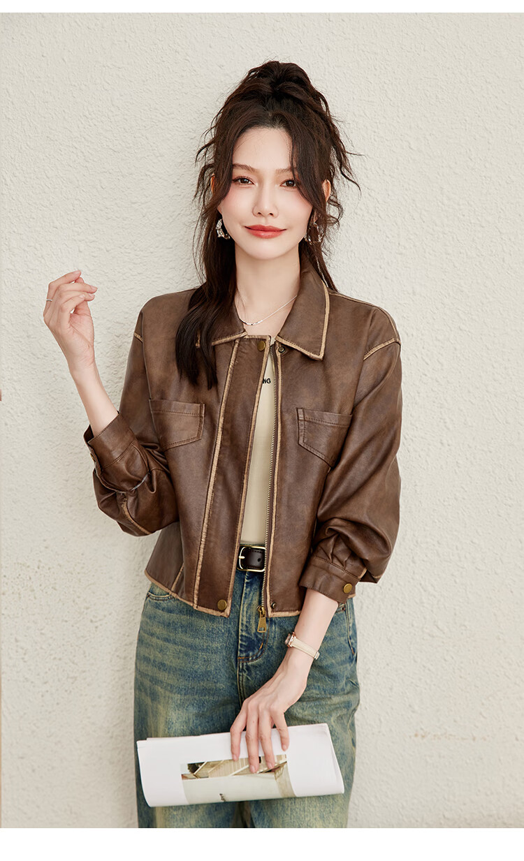 TERRE BLEUE Fashion Autumn Clothing 25 New Retro Motorcycle Leather Jacket Lapel Loose Sweet Cool Maillard Cardigan Jacket