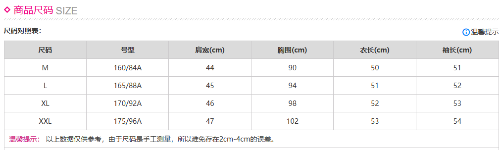 China (cm) 160-165/84-86 165-170 / 88-90 167-172 / 92-96 168-173 / 98-102 170-176 / 106-110