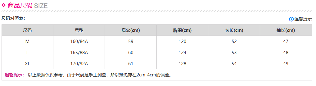 China (cm) 160-165/84-86 165-170 / 88-90 167-172 / 92-96 168-173 / 98-102 170-176 / 106-110