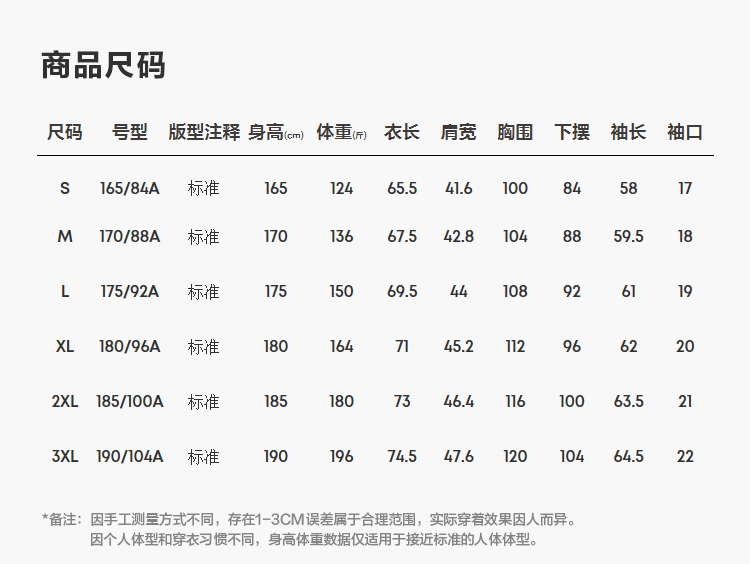 China (cm) 165 / 88-90 170 / 96-98 175 / 108-110 180 / 118-122 185 / 126-130