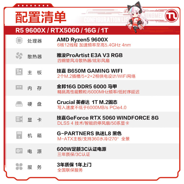 Ningmei AMD Ryzen5 9600X/RTX5060/16G/1T Game Assembly Computer Host Video Editing Rendering Desktop UPC
