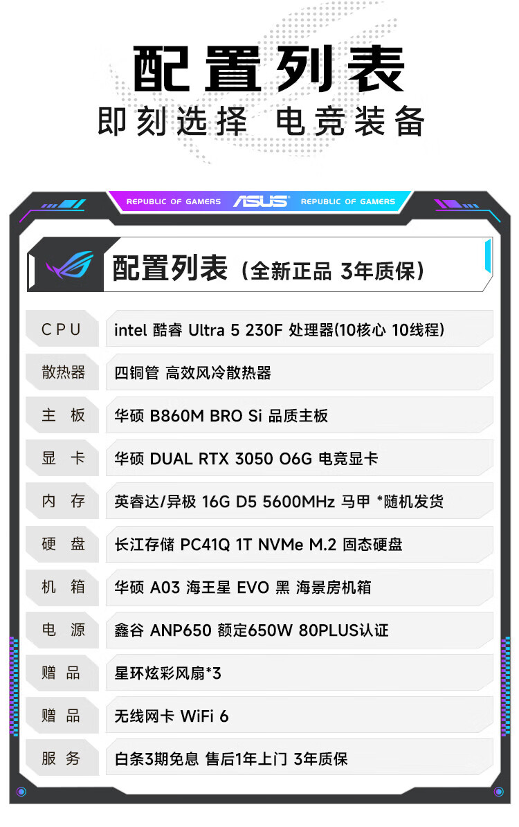 ASUS family bucket Ultra 5 230F/RTX3050/16G/1T/WiF6/design e-sports game computer host assembly computer desktop computer complete machine