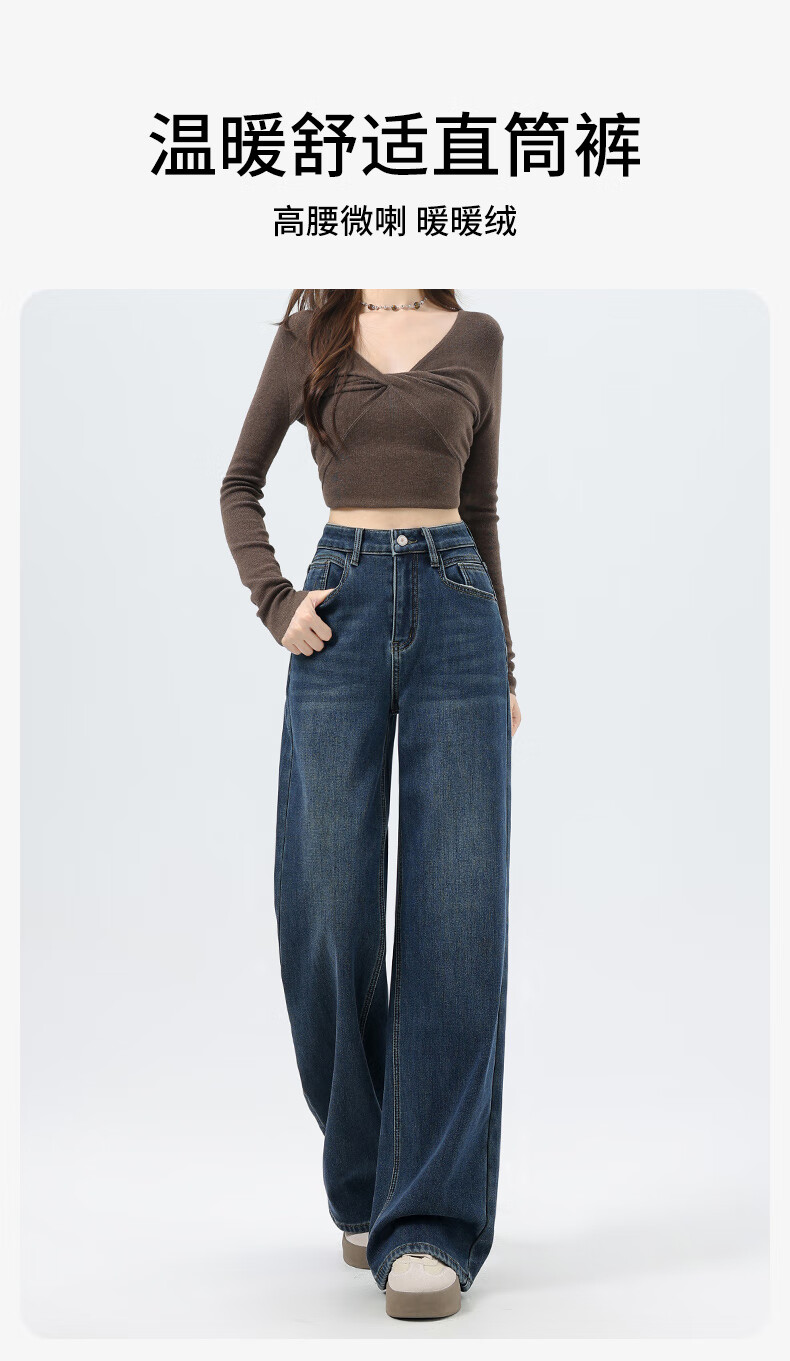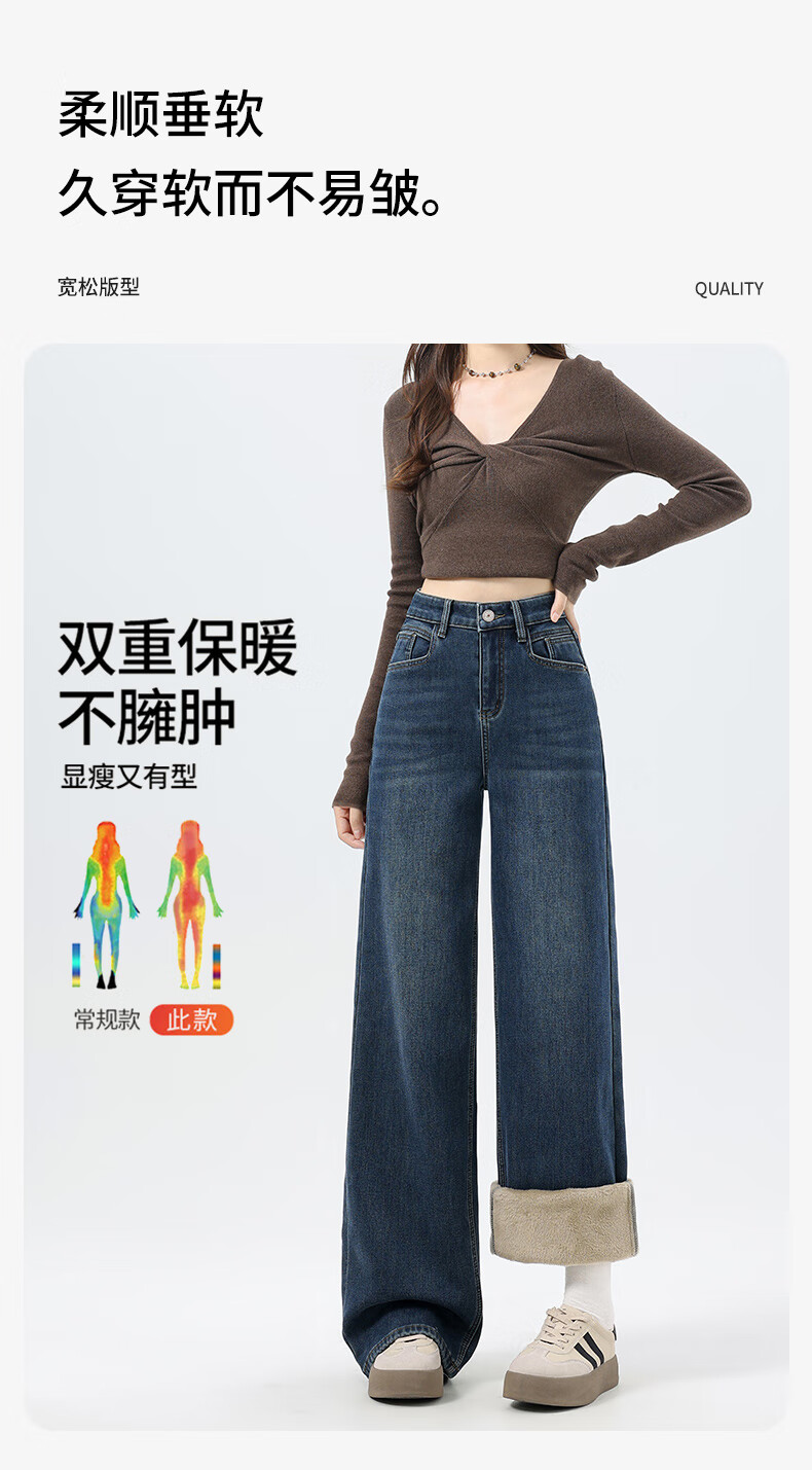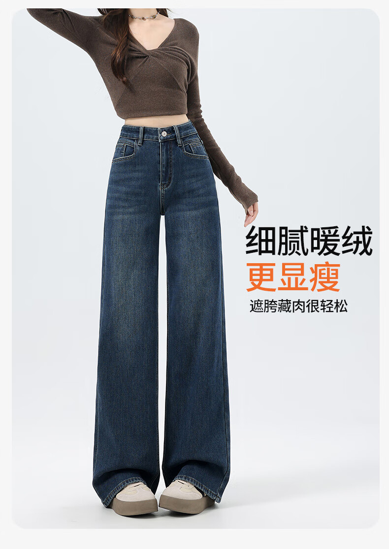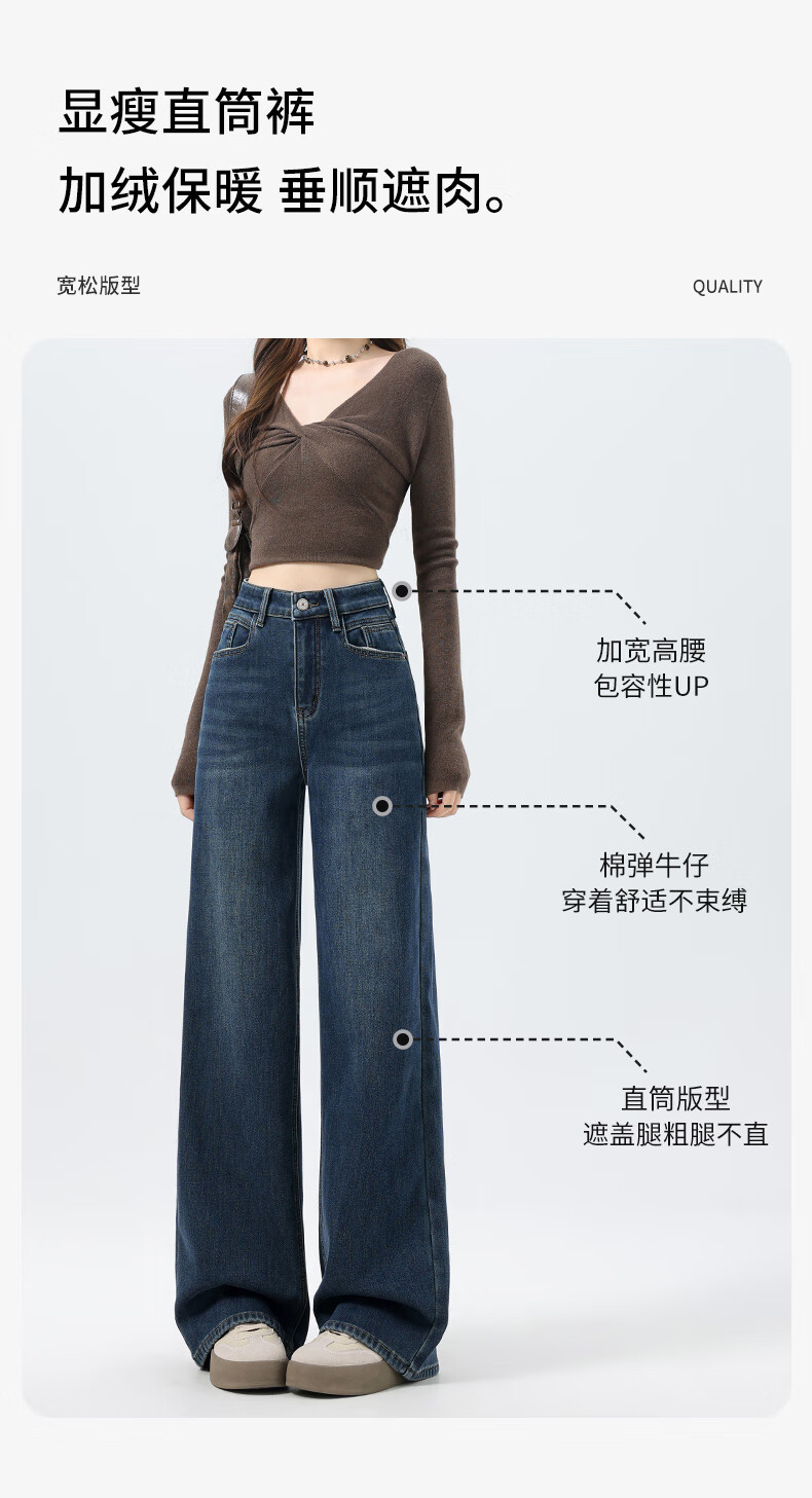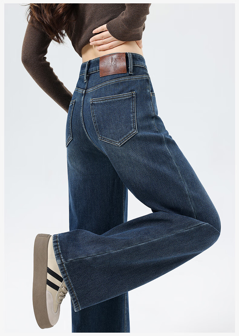 La Chapelle women's jeans with velvet and thickening 2025 autumn and winter new high-waisted hip-covering slimming and versatile straight pants