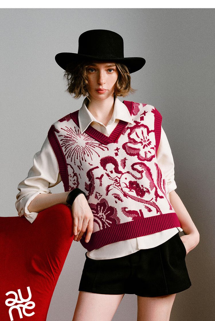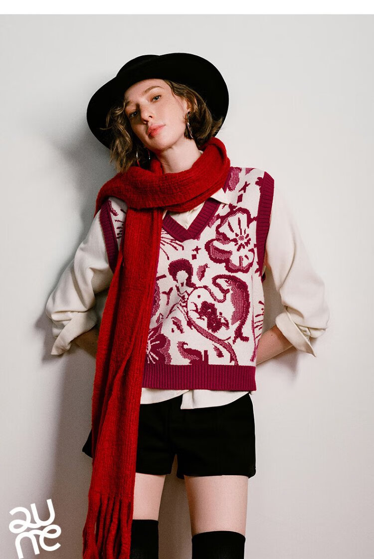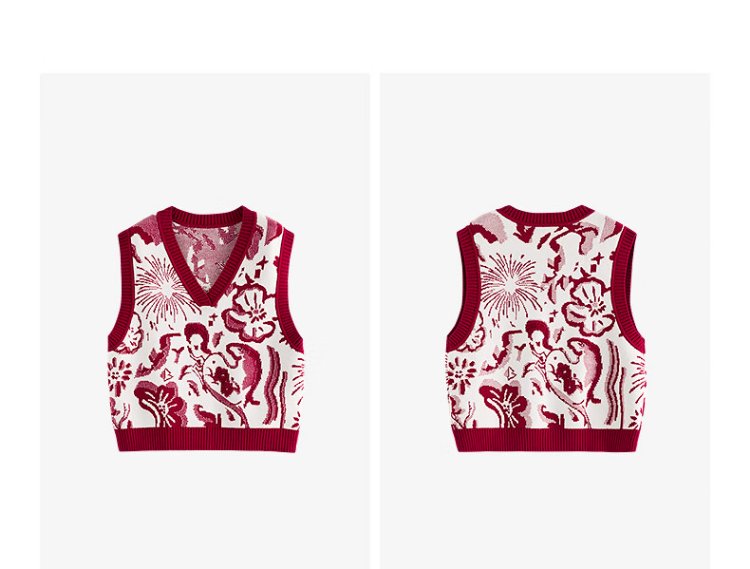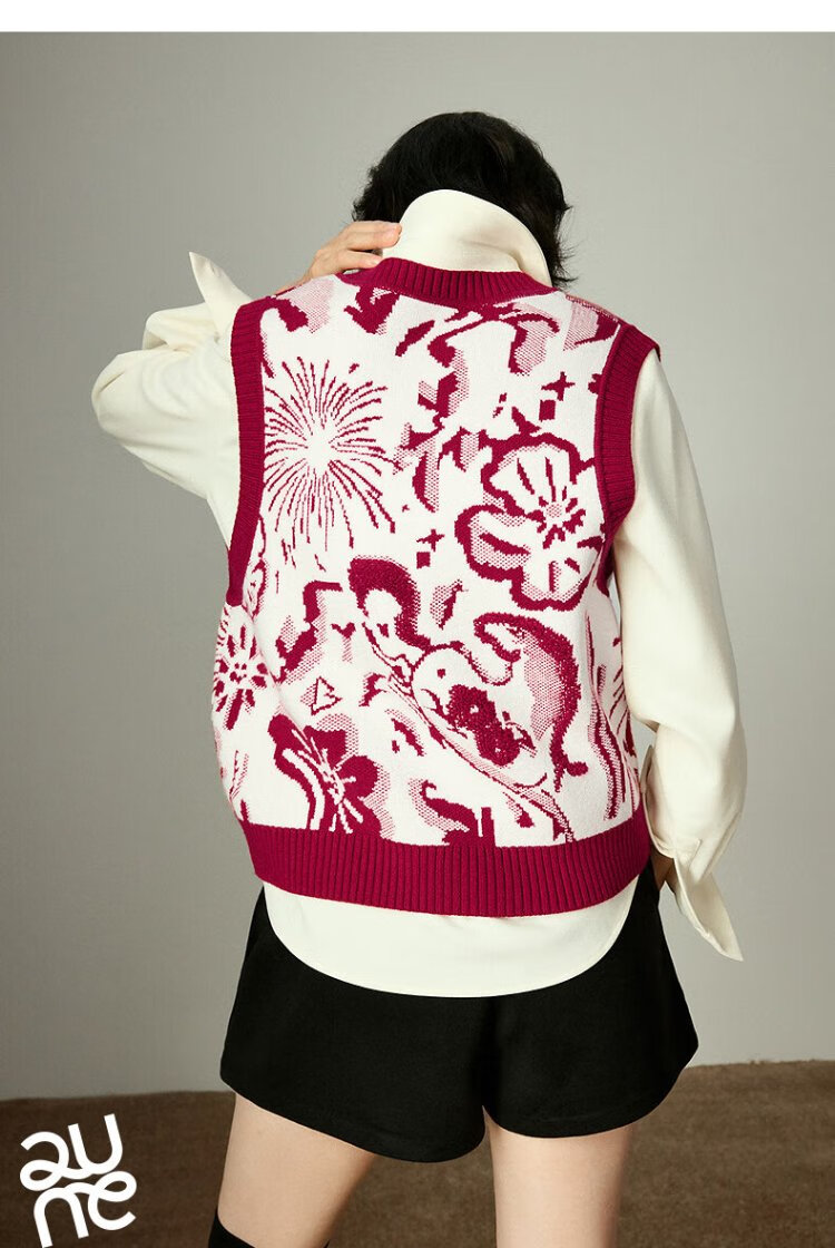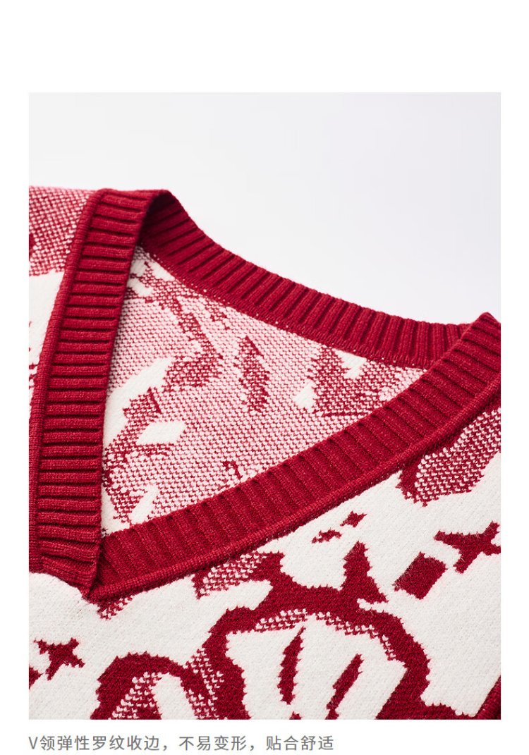 Chuyu Mengzhu Daji co-branded New Year's knitted vest for women 2025 Winter Art Year of the Horse Totem Top New Year Red M