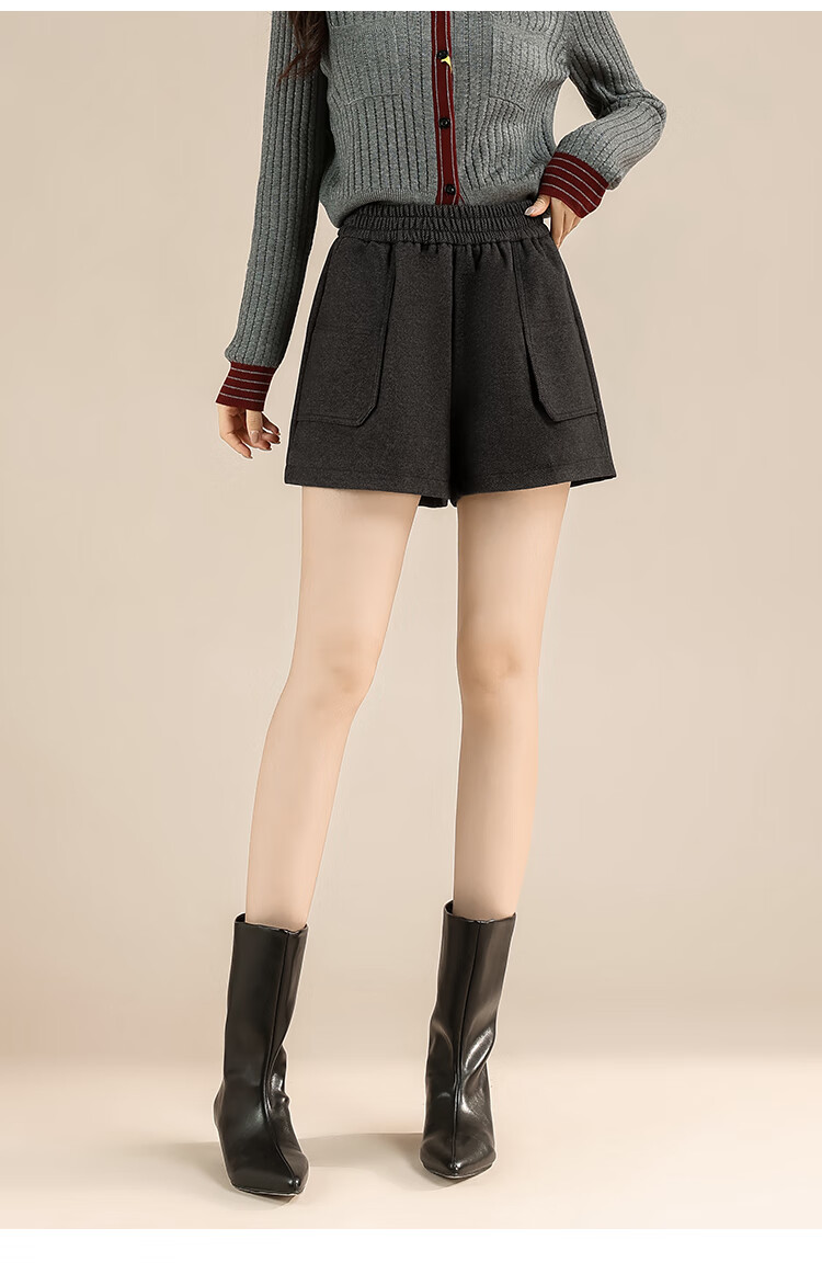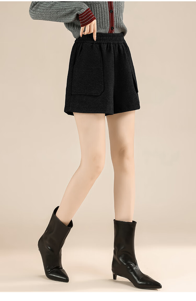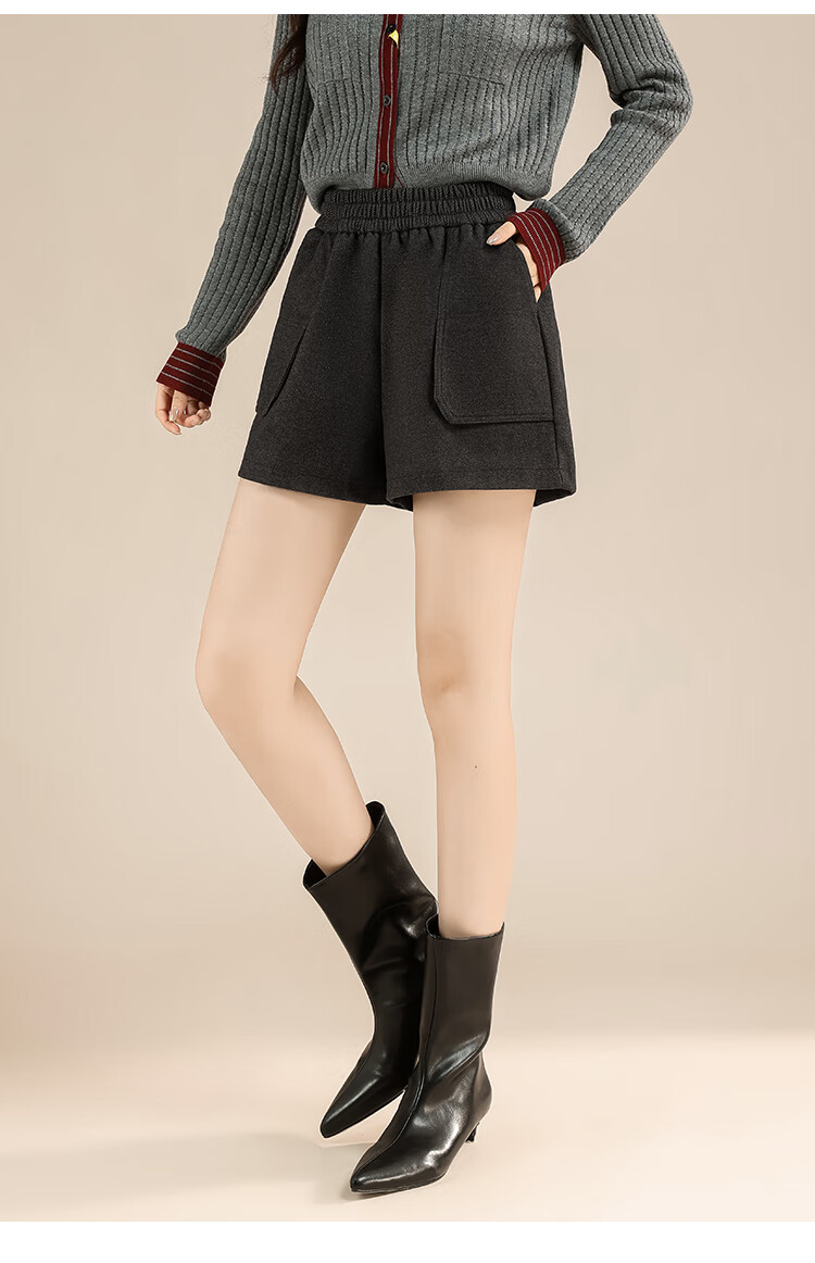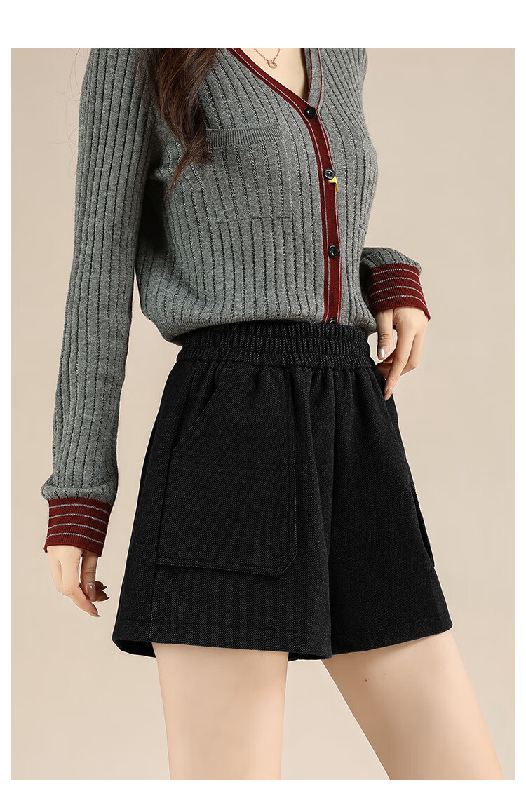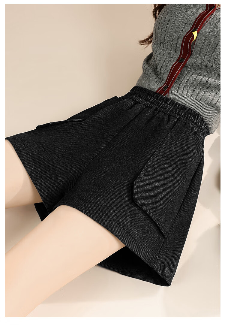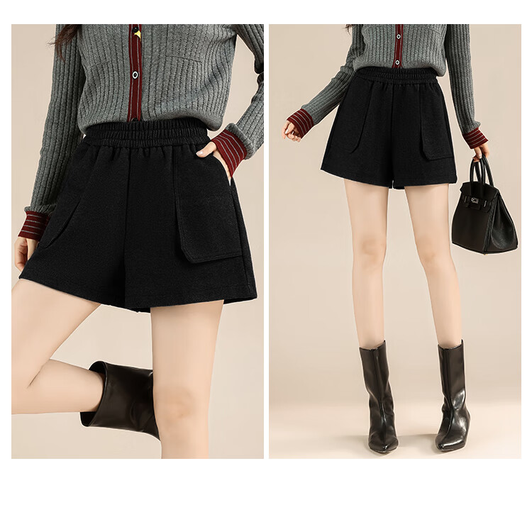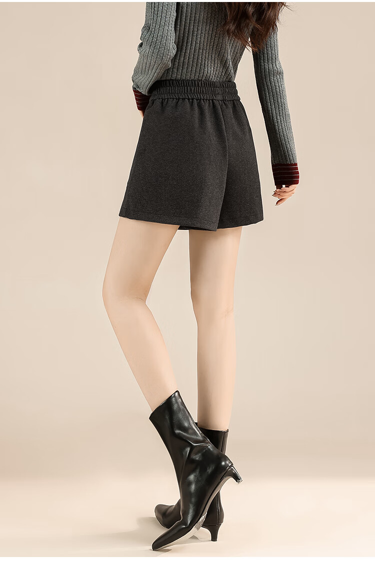 TERRE BLEUE High Waisted Woolen Shorts Retro Style 2025 Autumn and Winter New Women's Elastic Waist Suit Shorts Black M