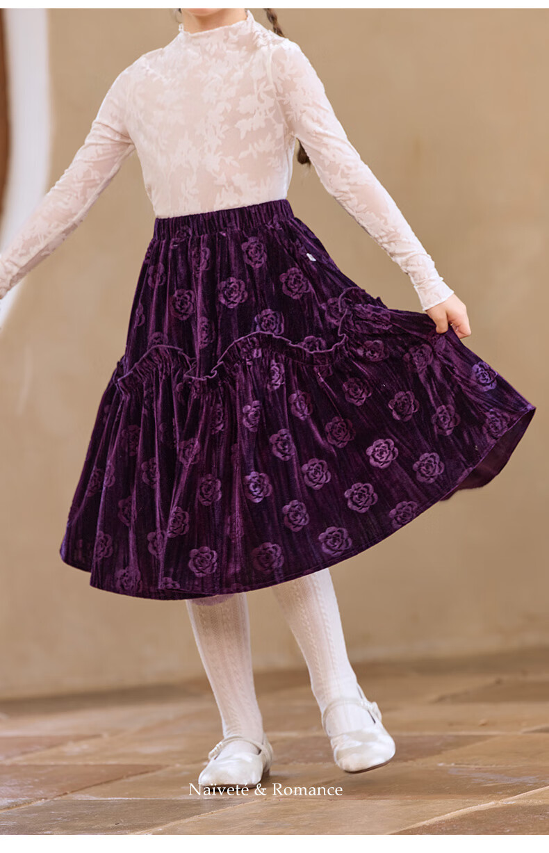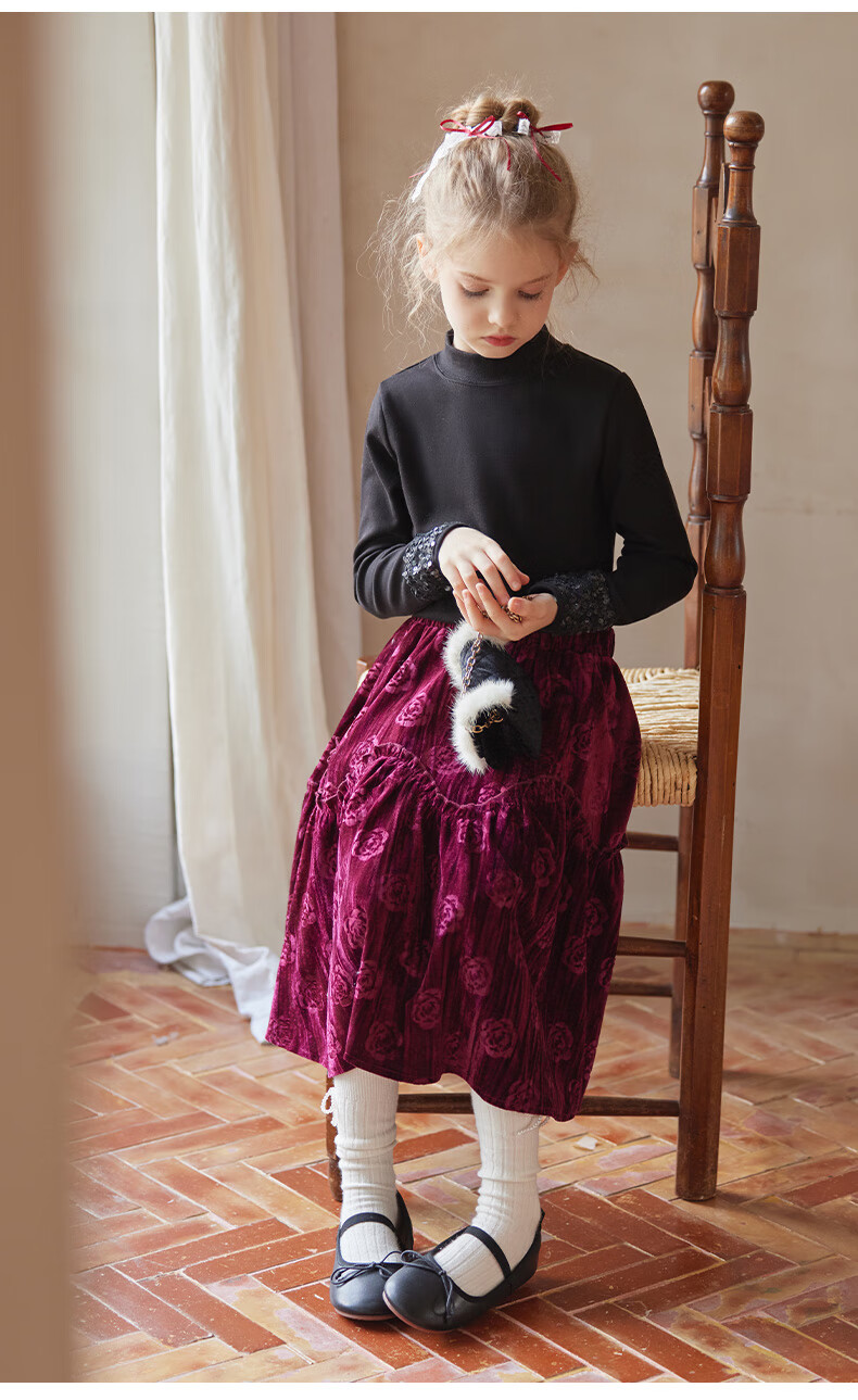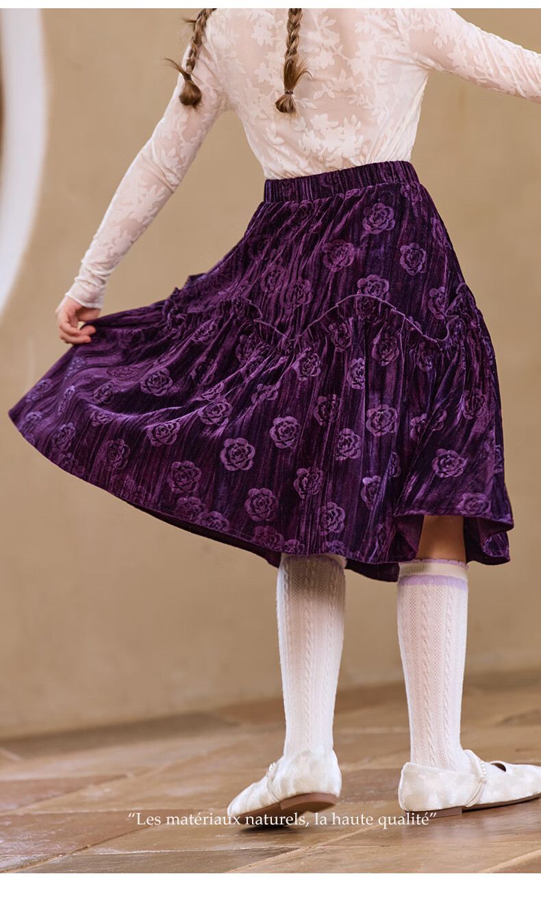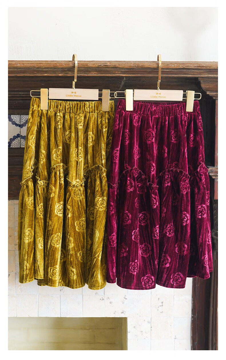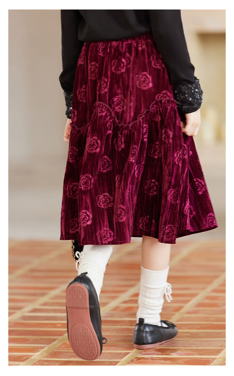 Little Naive Girls Skirt Autumn and Winter New Children's Flower Crumpled Retro Velvet Skirt Burgundy 130 New Year's Eve Clothes