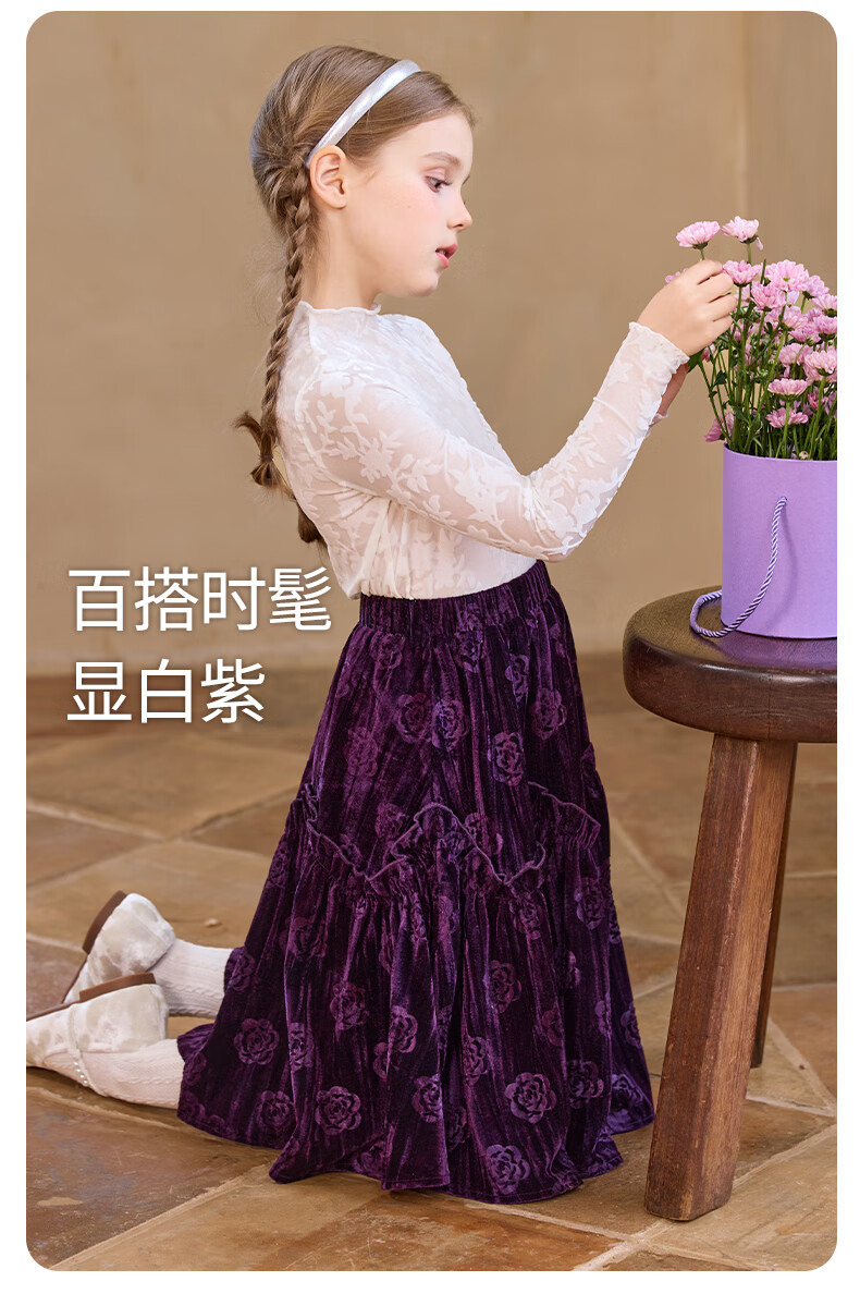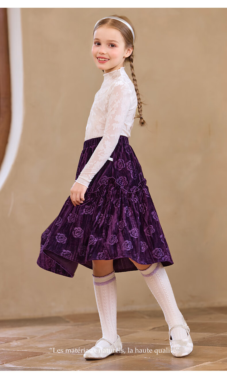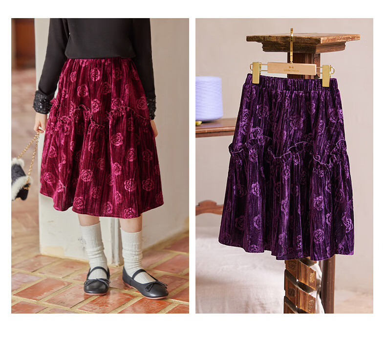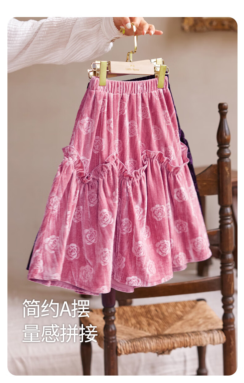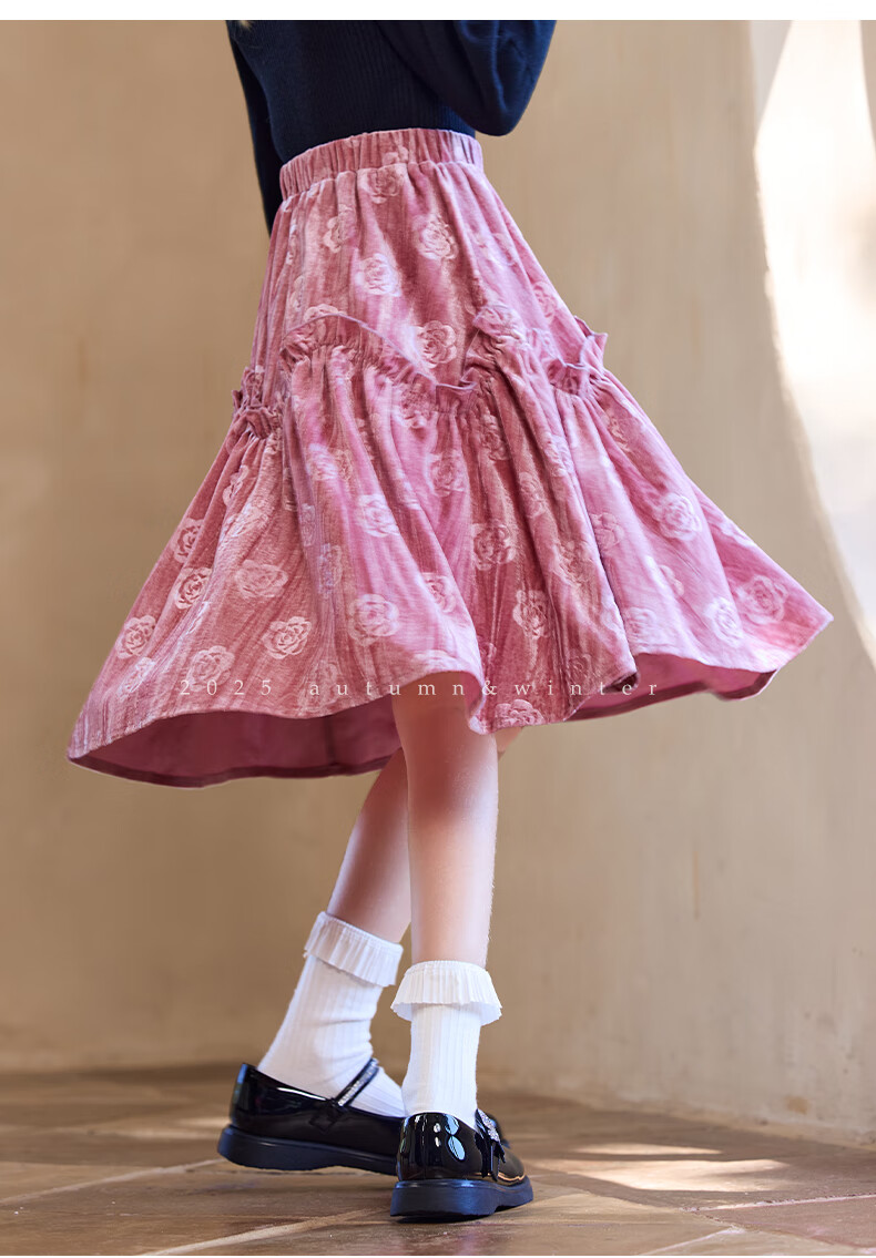 Little Naive Girls Skirt Autumn and Winter New Children's Flower Crumpled Retro Velvet Skirt Burgundy 130 New Year's Eve Clothes