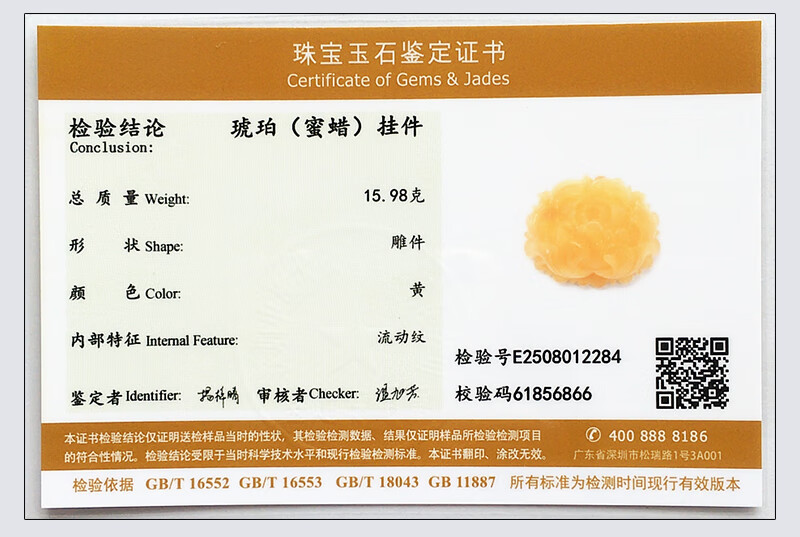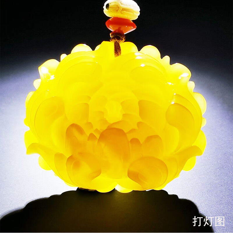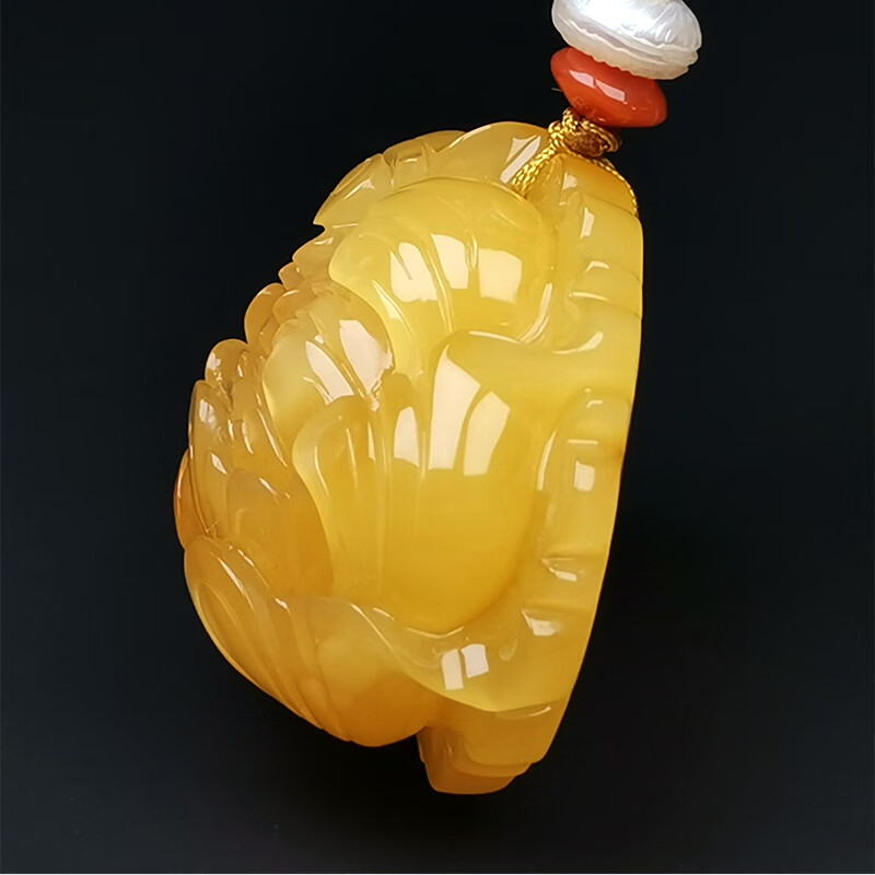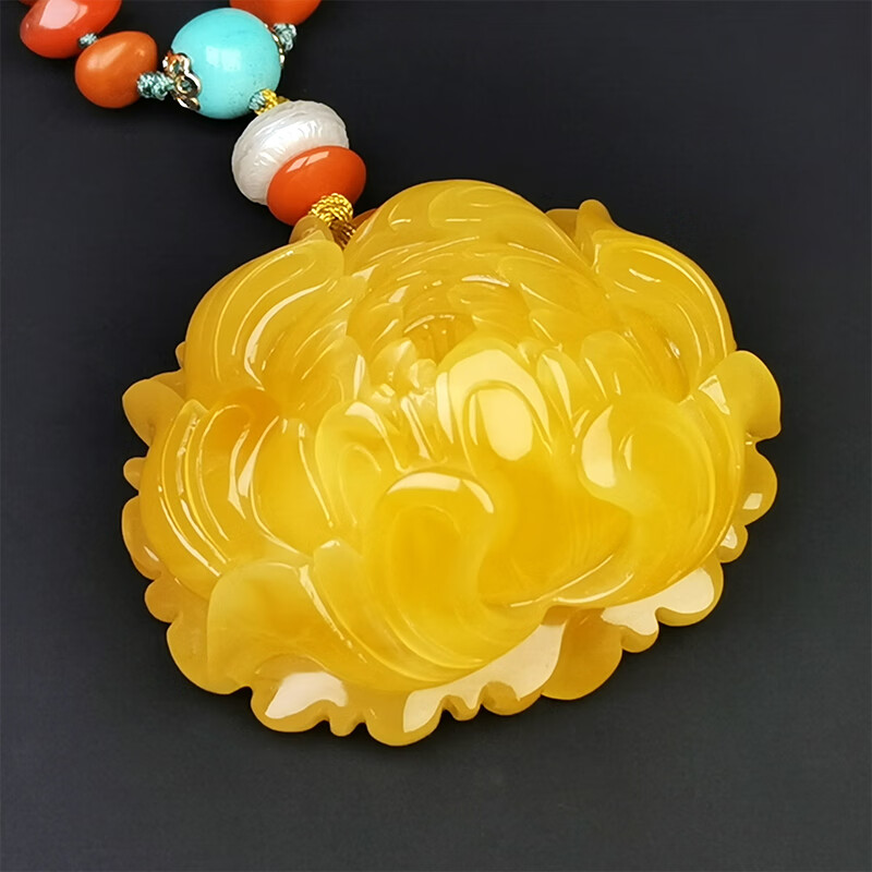 Hupai, one thing, one picture, one certificate, natural beeswax pendant, carved peony flower pendant, sweater chain necklace, chicken fat yellow, flower pendant, 15.98g, 33*40*20mm