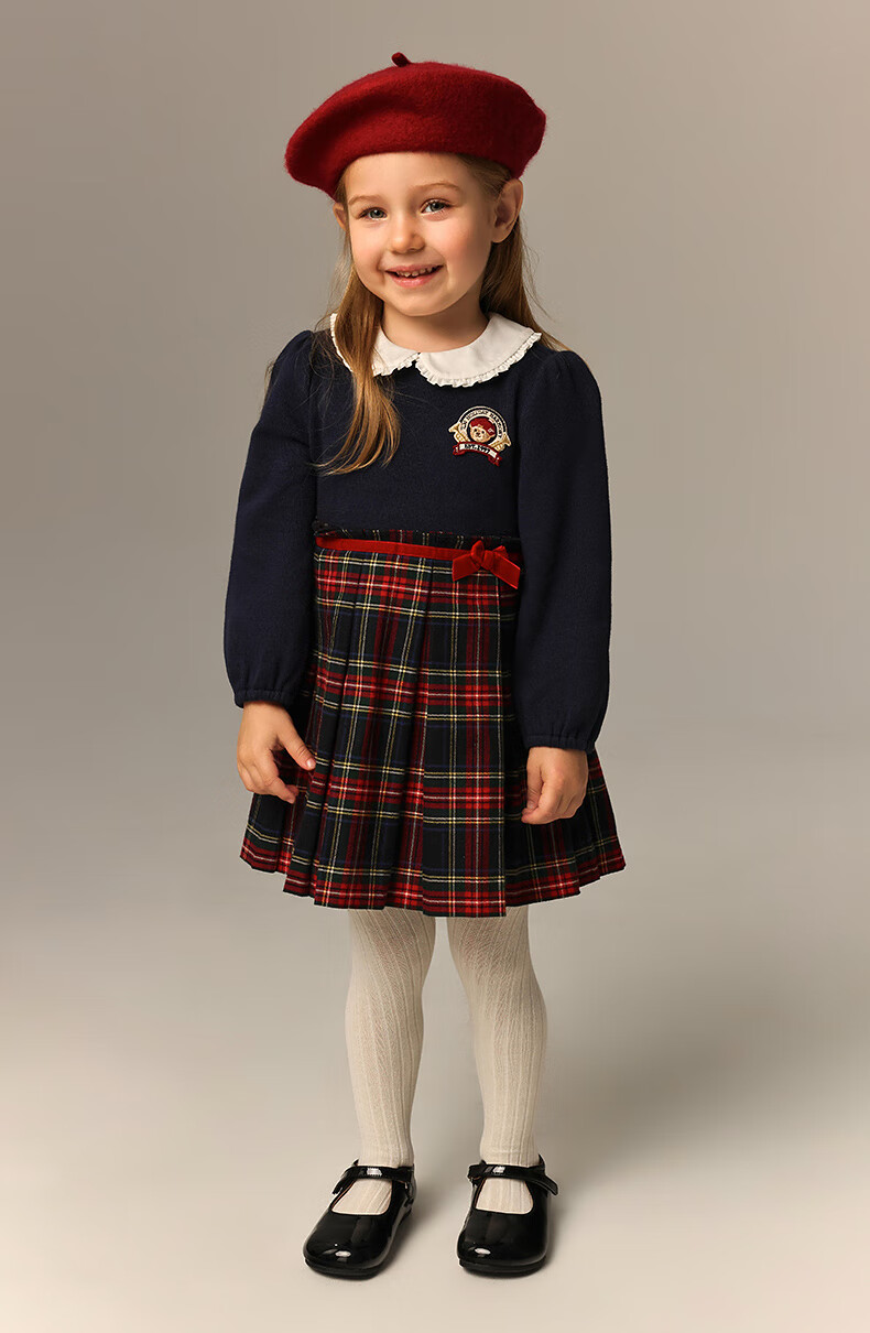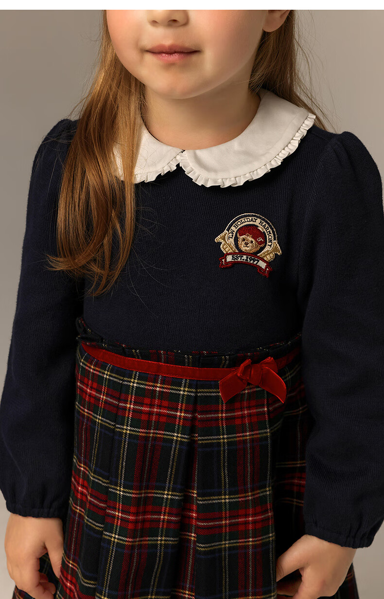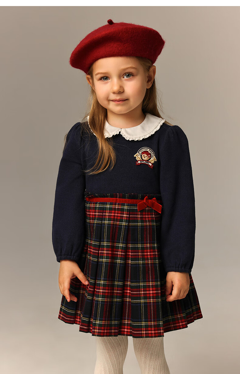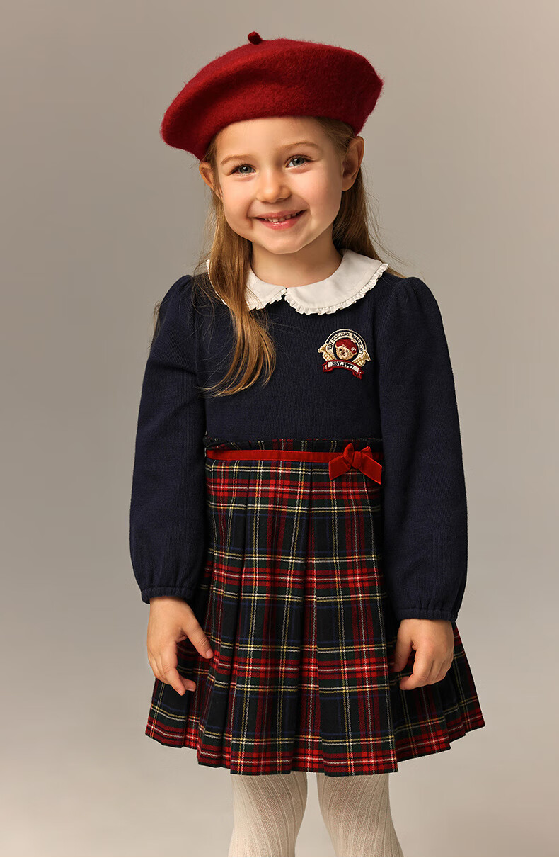 Teenie Weenie Kids 26 years new baby girl patchwork plaid long-sleeved dress navy blue 90cm