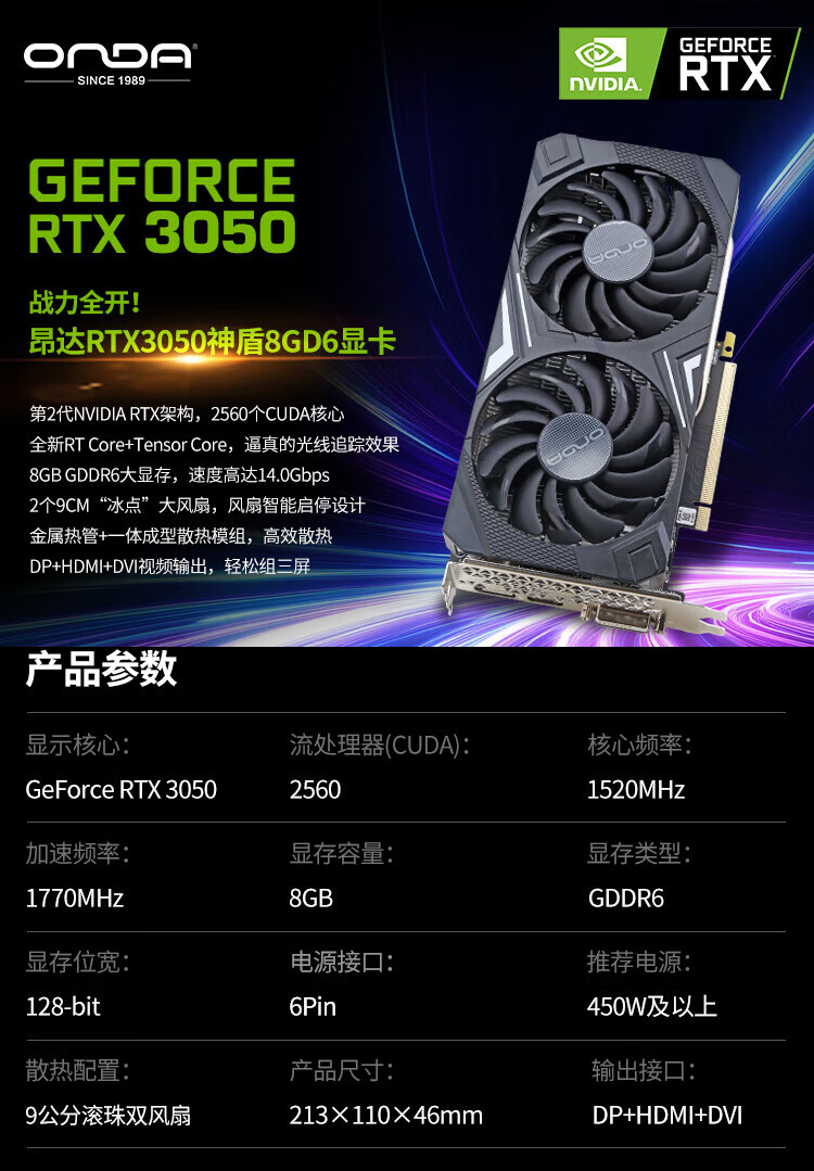 ONDA RTX3050 Aegis 8GD6 V2 8GB large video memory GDDR6 E-sports game design intelligent learning professional computer graphics card