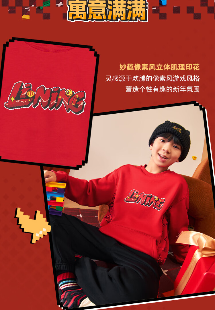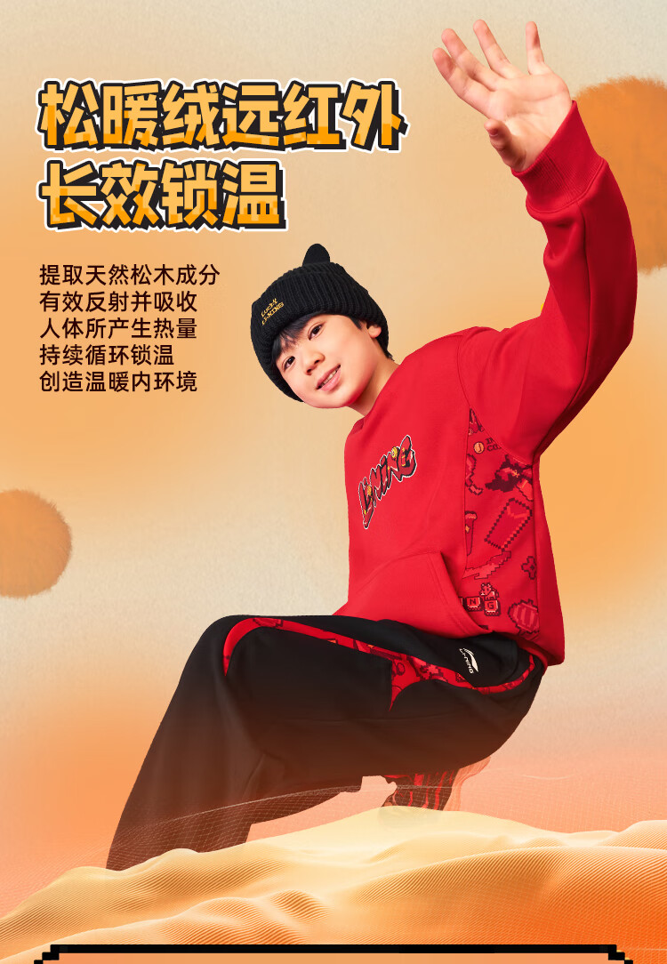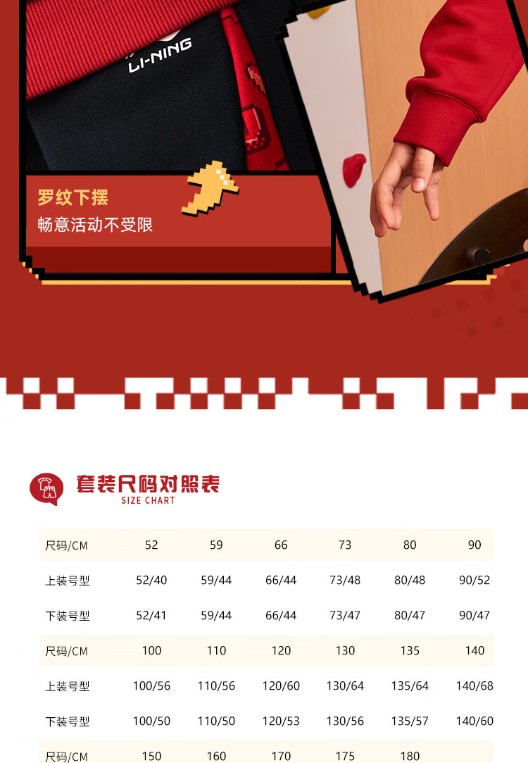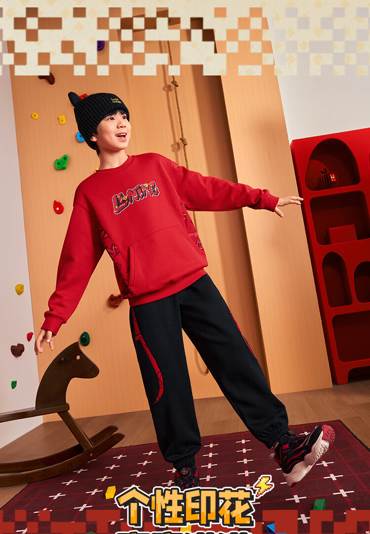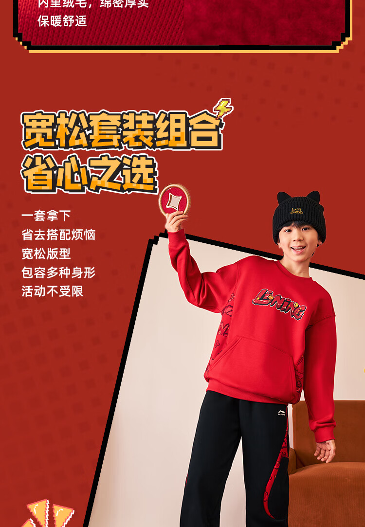 Li Ning (LI-NING) children's clothing children's sports suits for men and women, small and big children, New Year's style velvet antibacterial sweatshirt suit 160YWEW001-1