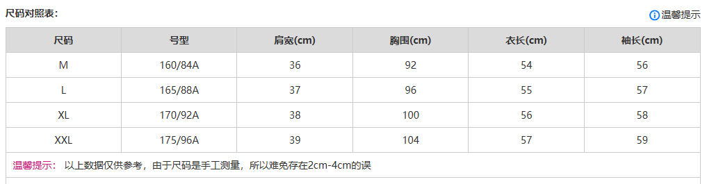 China (cm) 160-165/84-86 165-170 / 88-90 167-172 / 92-96 168-173 / 98-102 170-176 / 106-110