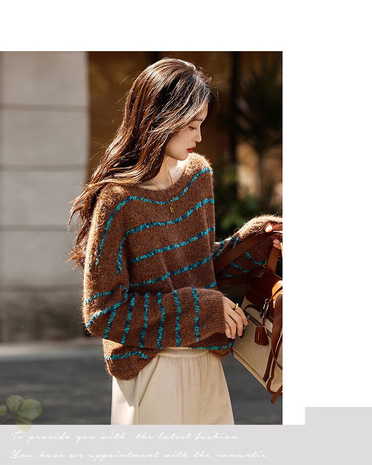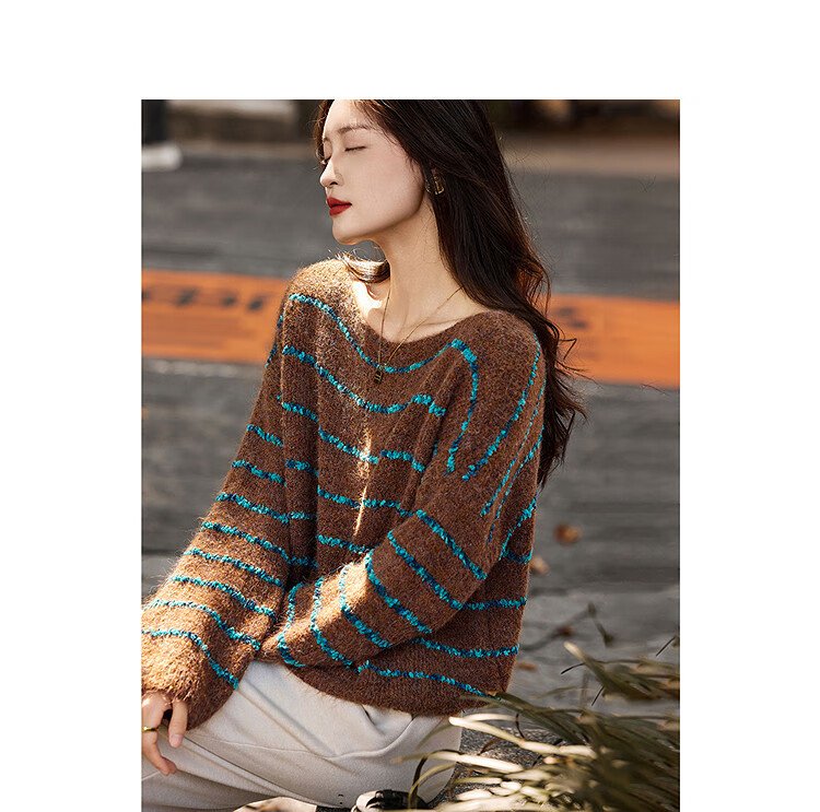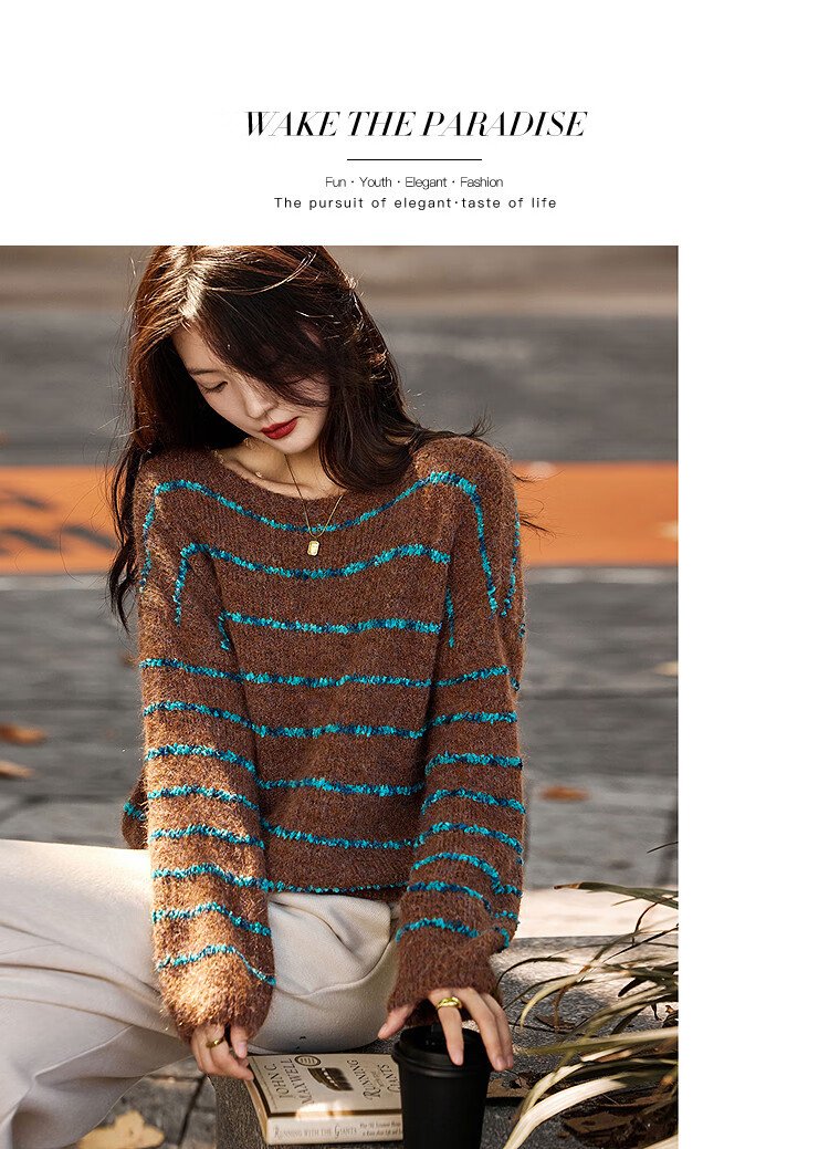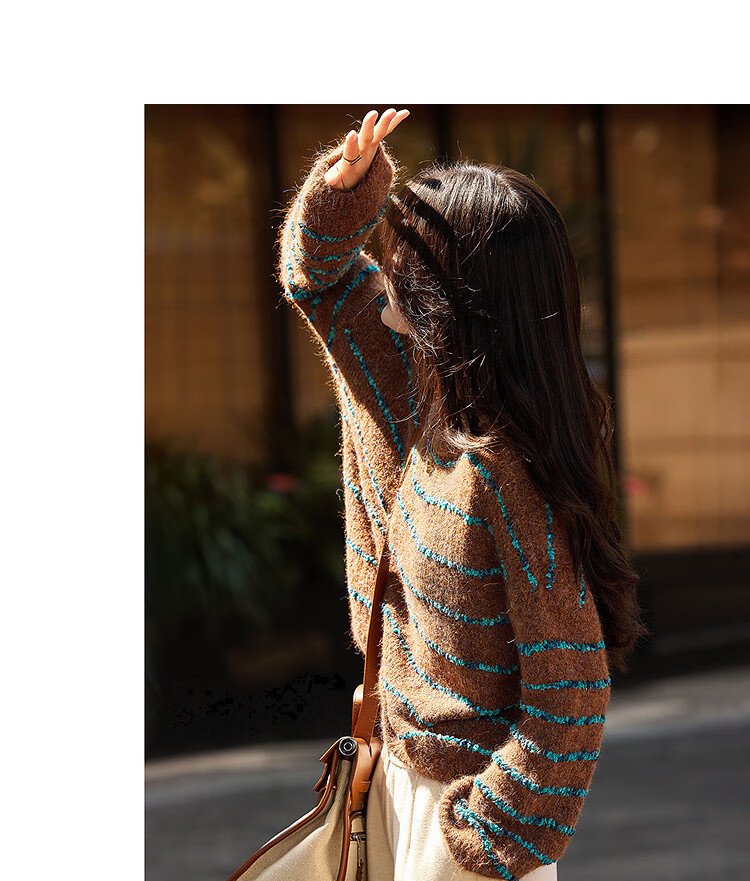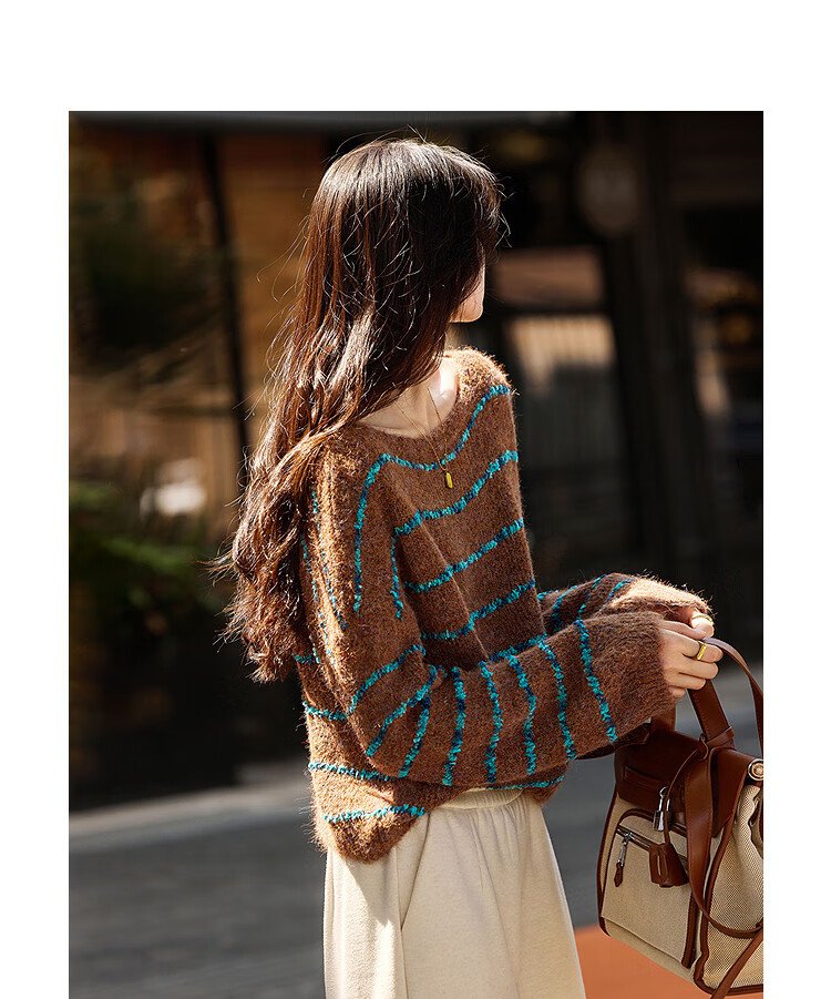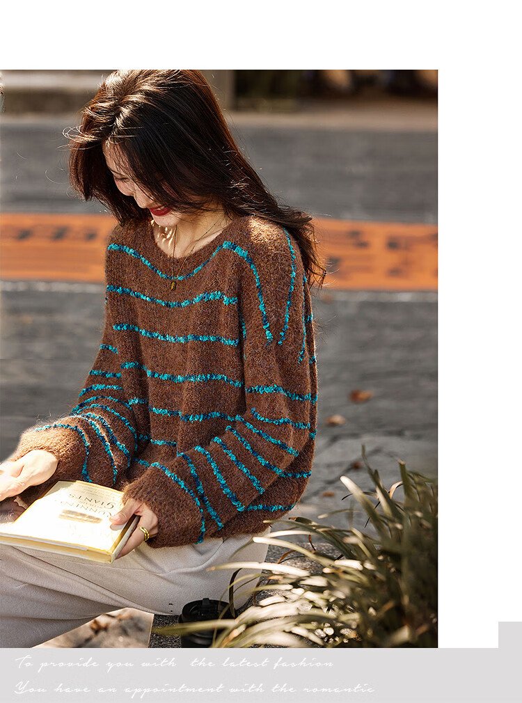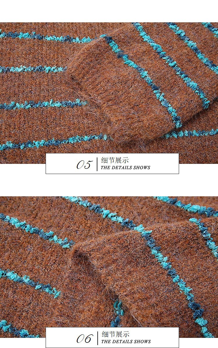 Awakening Paradise Winter Fashion Lazy Style Retro Brushed Temperament Round Neck Striped Sweater Pullover Knitwear Brown One Size