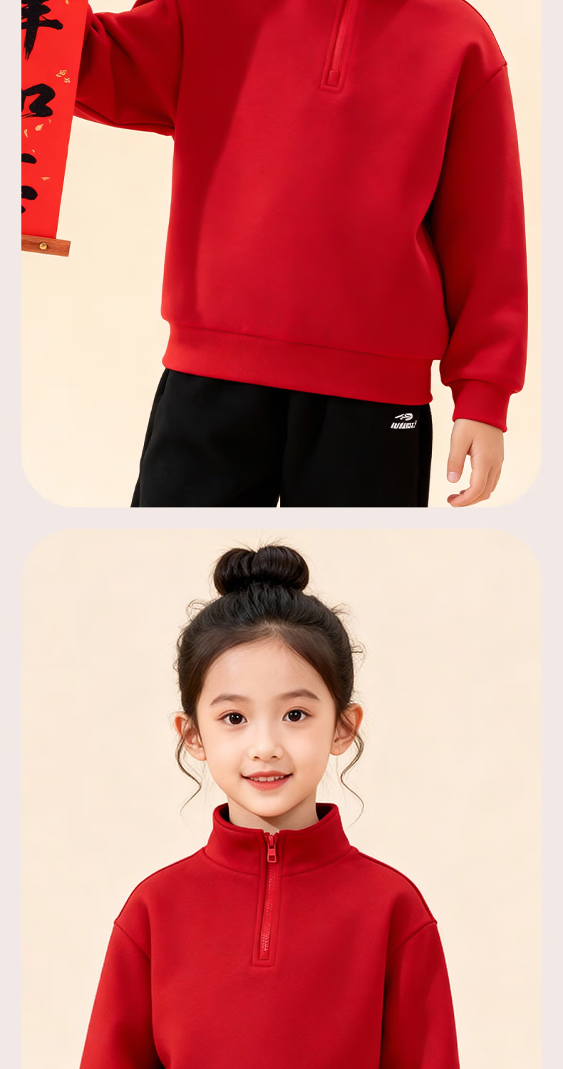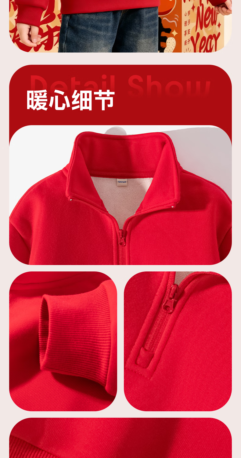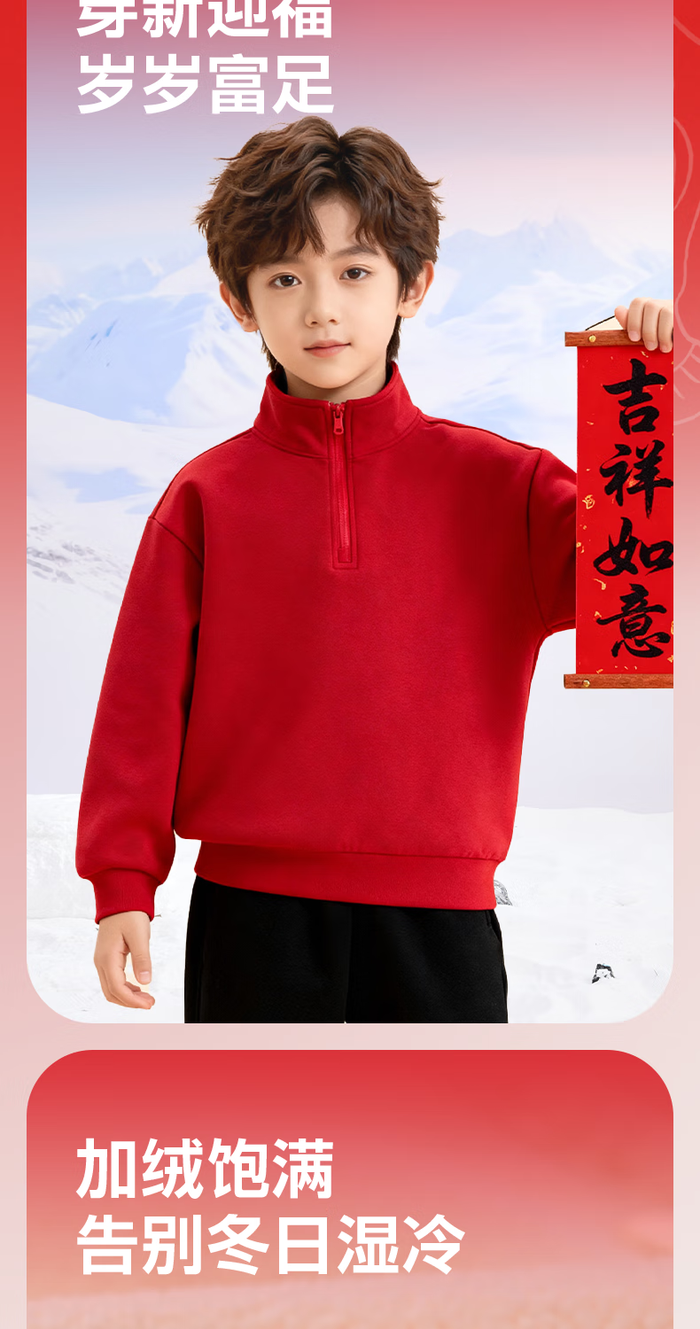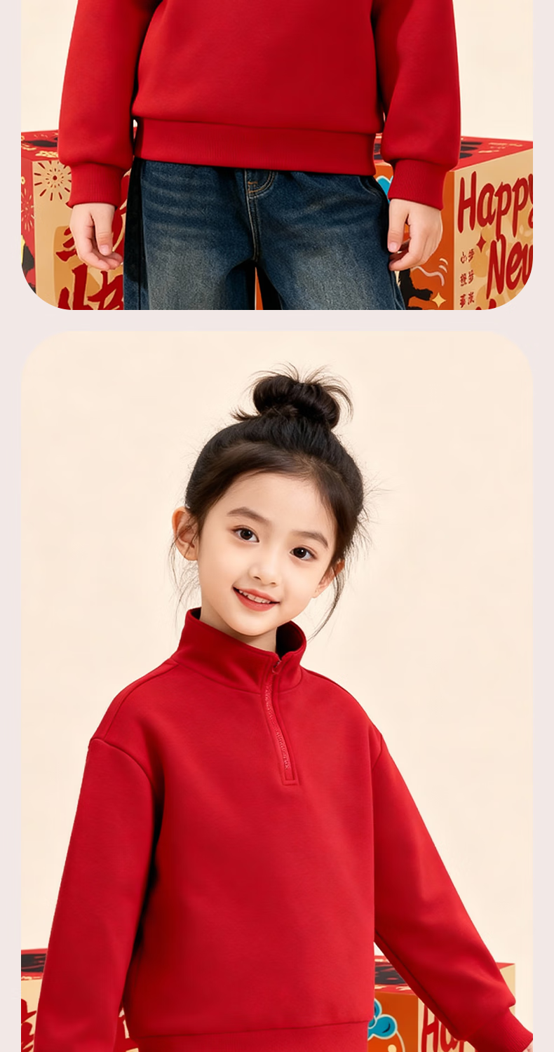 Jeanswest children's red sweatshirt children's autumn and winter 2025 new boys' New Year's greetings clothes plus velvet half-cardigan New Year's clothes for the Year of the Horse