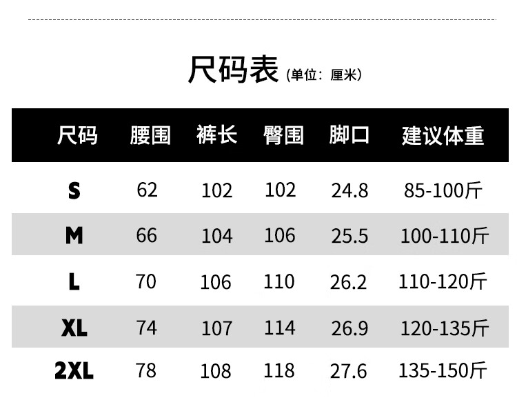 Outseam (cm) 99 cm 101.5 cm 104 cm 106.5 cm 109 cm