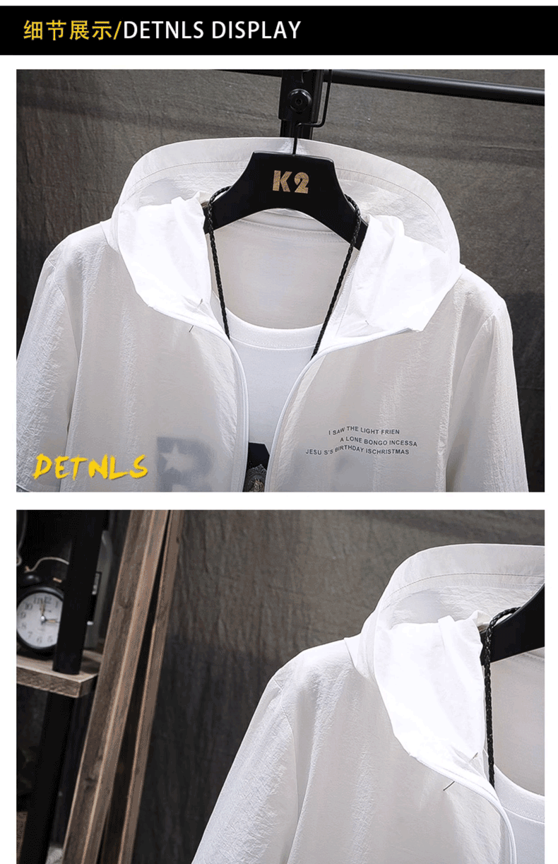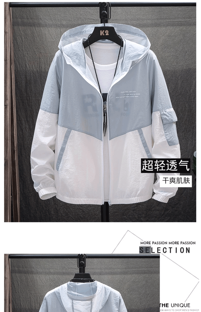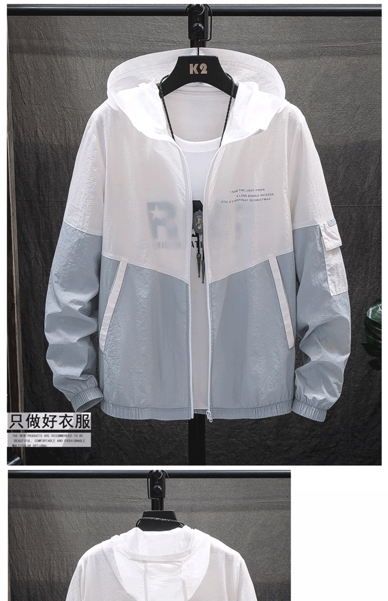 Woodpecker Ice Silk Sun Protection Jacket Men's Summer Thin Breathable Hooded Fishing Cycling Casual Outdoor Men's Jacket Top White and Bottom Blue XL