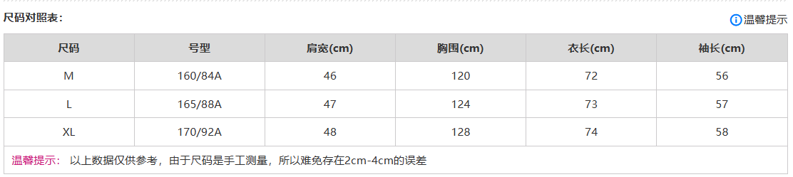 China (cm) 160-165/84-86 165-170 / 88-90 167-172 / 92-96 168-173 / 98-102 170-176 / 106-110