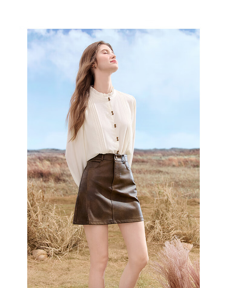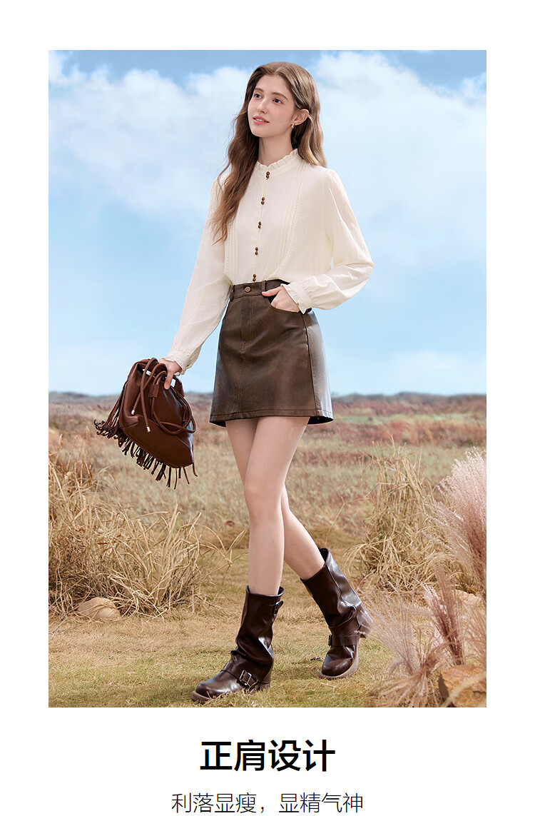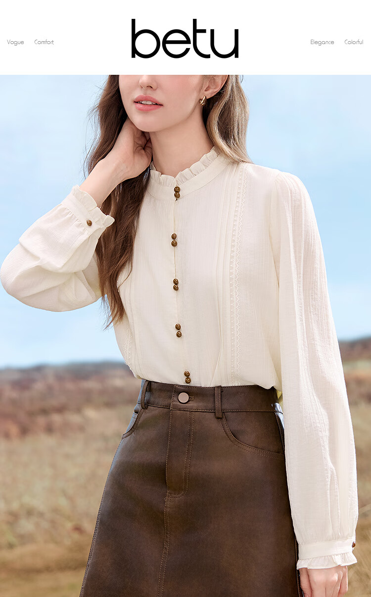 Betu women's 2025 autumn new shirt high-end commuting ruffle collar color-blocked button design top 2509T65