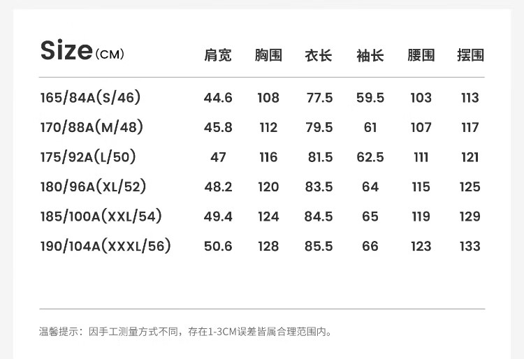 China (cm) 165 / 88-90 170 / 96-98 175 / 108-110 180 / 118-122 185 / 126-130