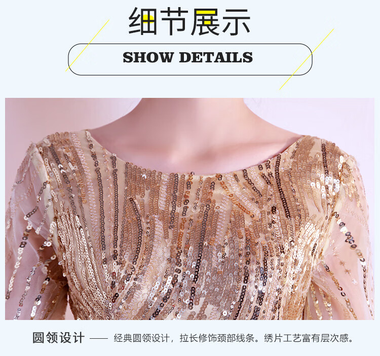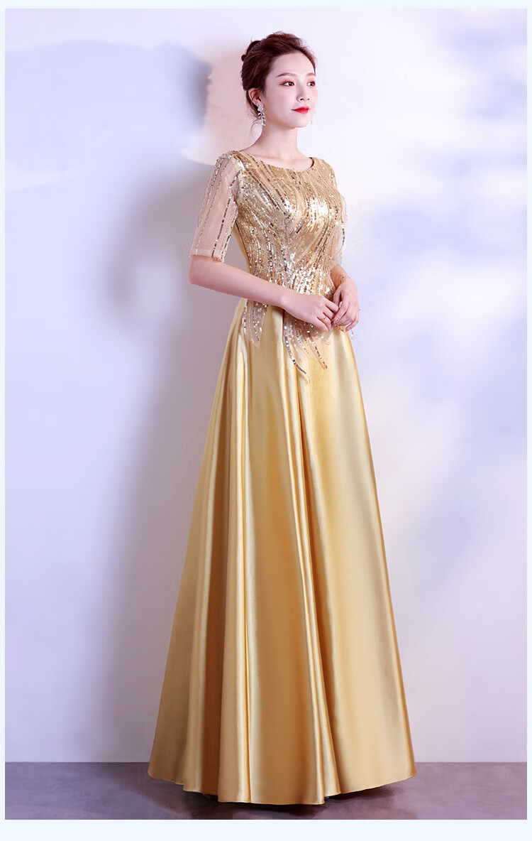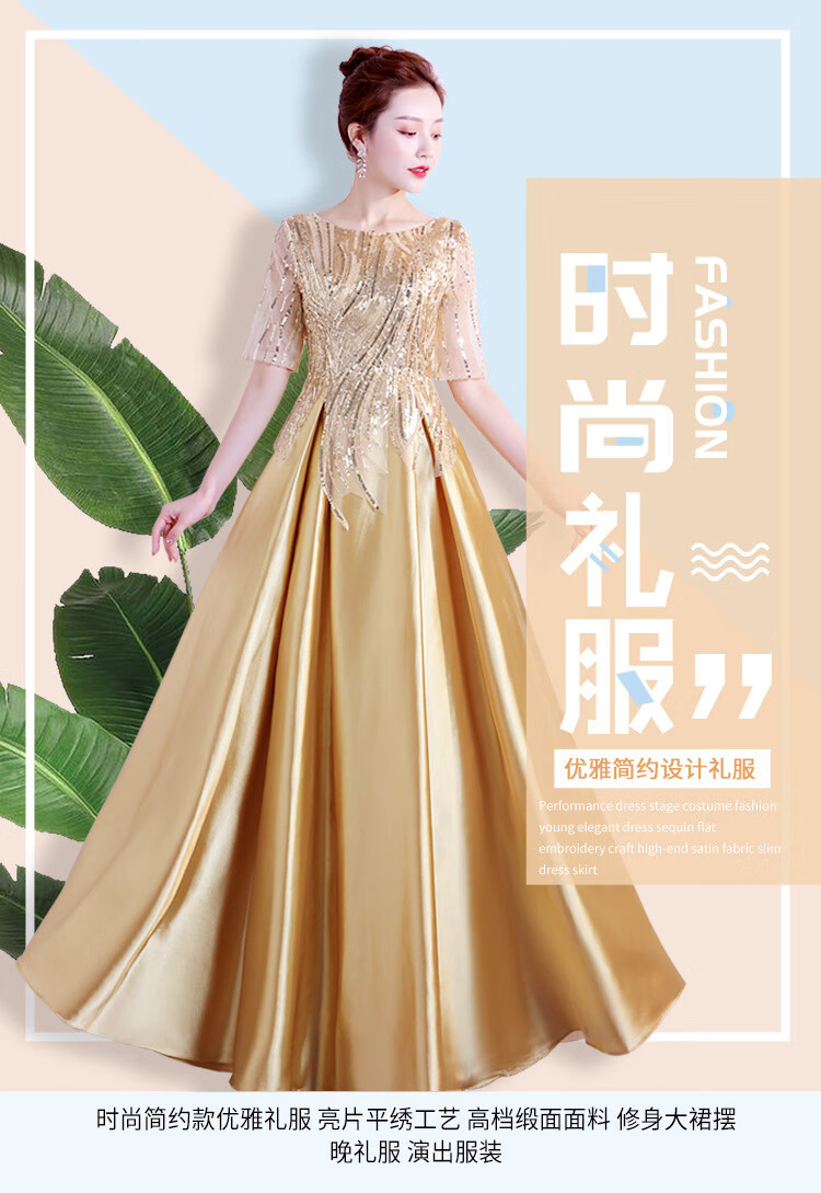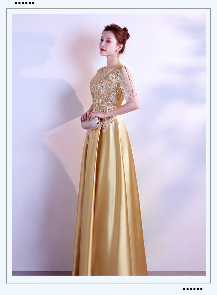 Pugos New Cantata Performance Clothing Women's Group Long Skirt Stage Chorus Clothing Student Host Poetry Recitation Evening Dress Champagne Color Middle-aged and Elderly Chorus Clothing XL