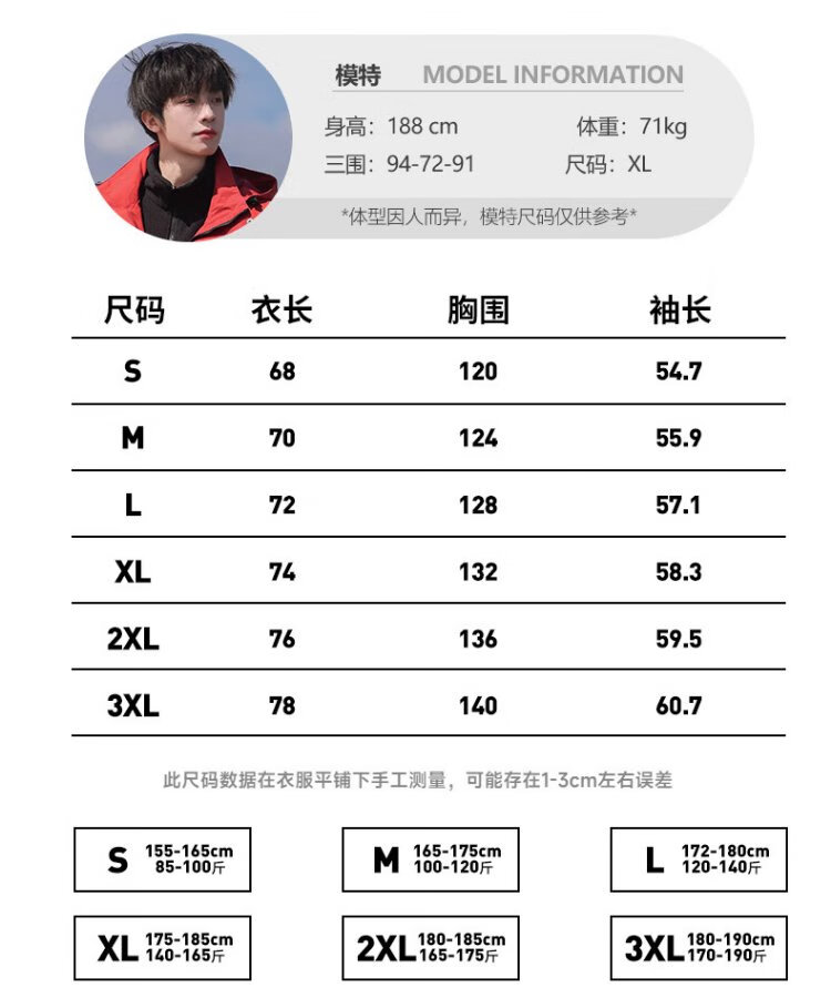 China (cm) 165 / 88-90 170 / 96-98 175 / 108-110 180 / 118-122 185 / 126-130
