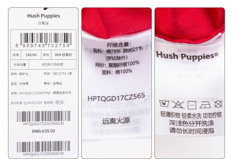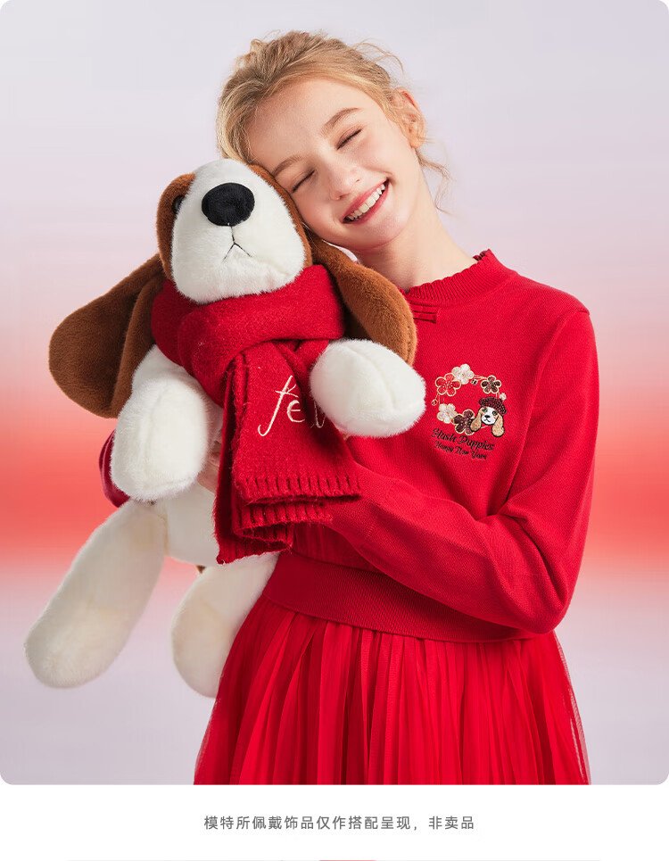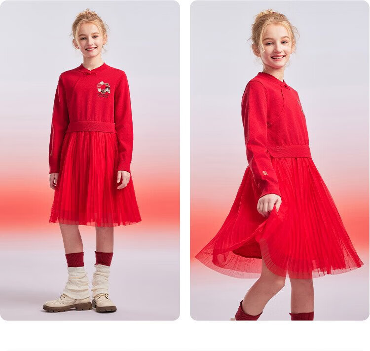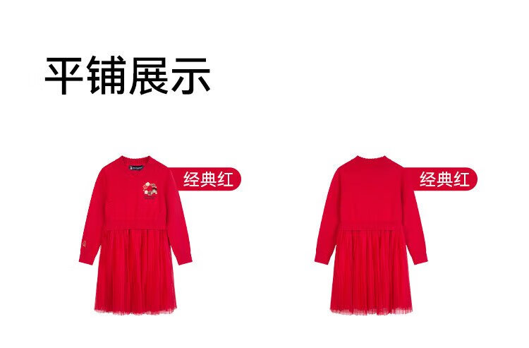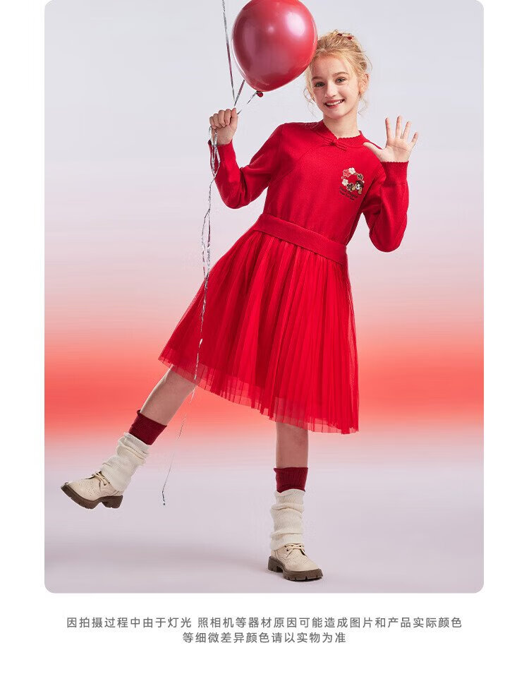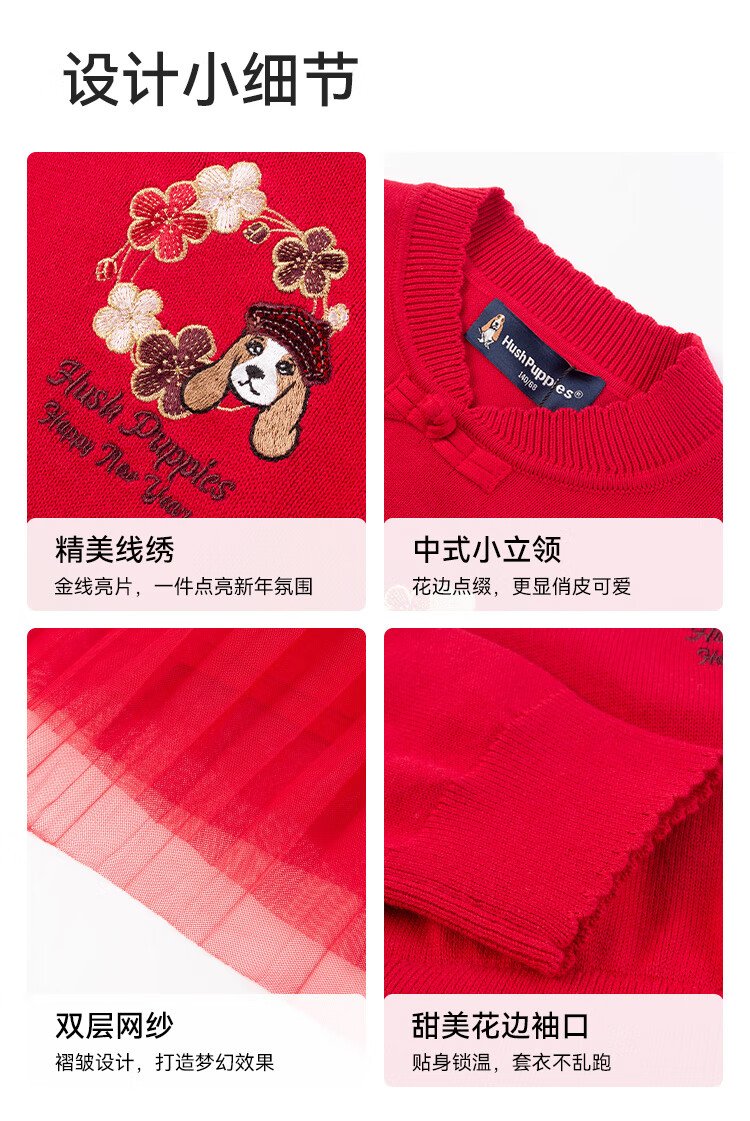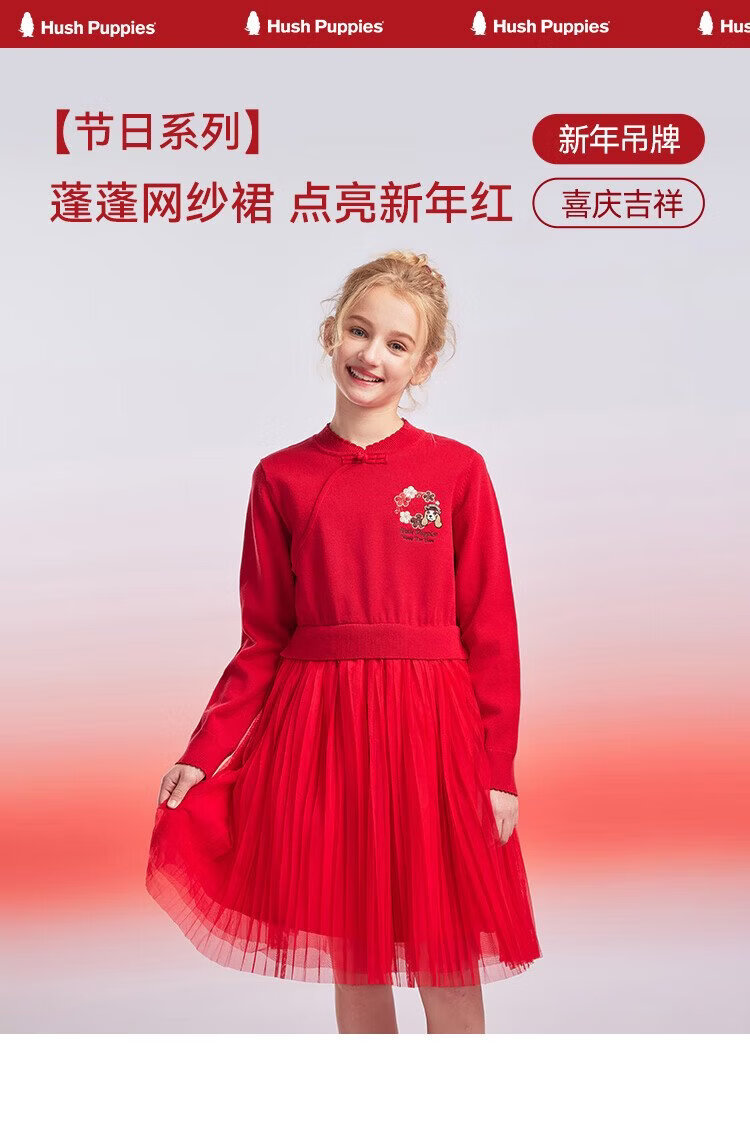 Hush Puppies children's clothing girls' dress medium and large children's sweet long-sleeved dress New Year's greetings dress New Year's style classic red 150