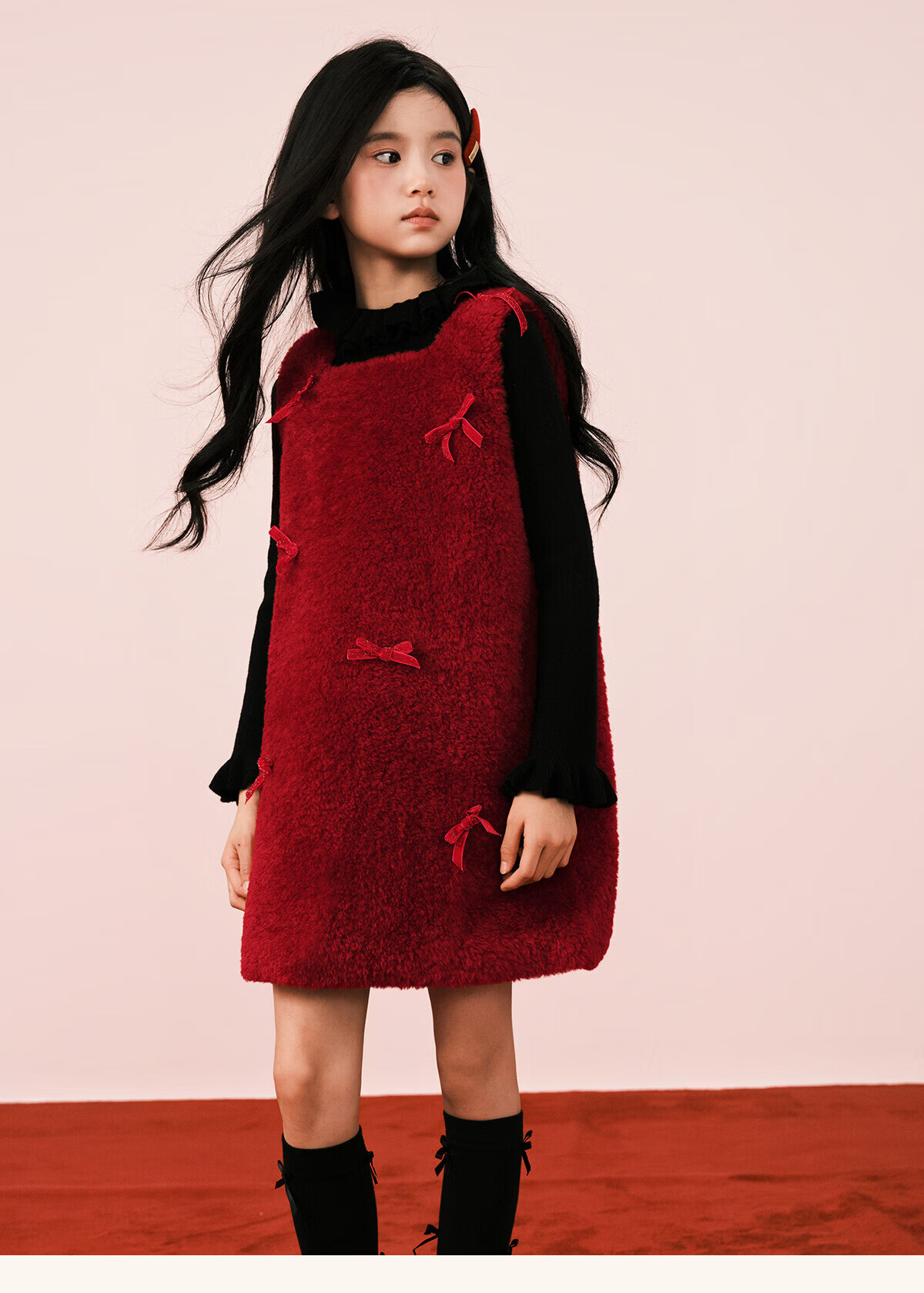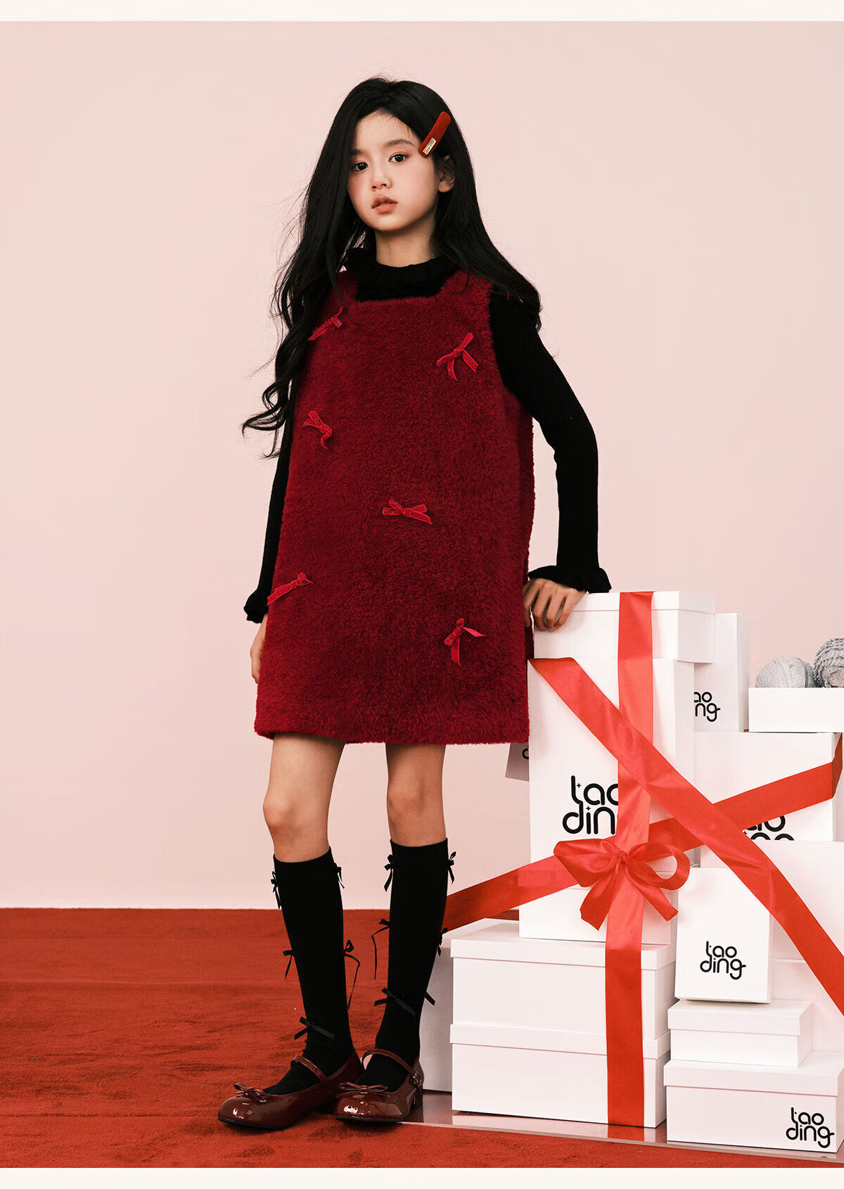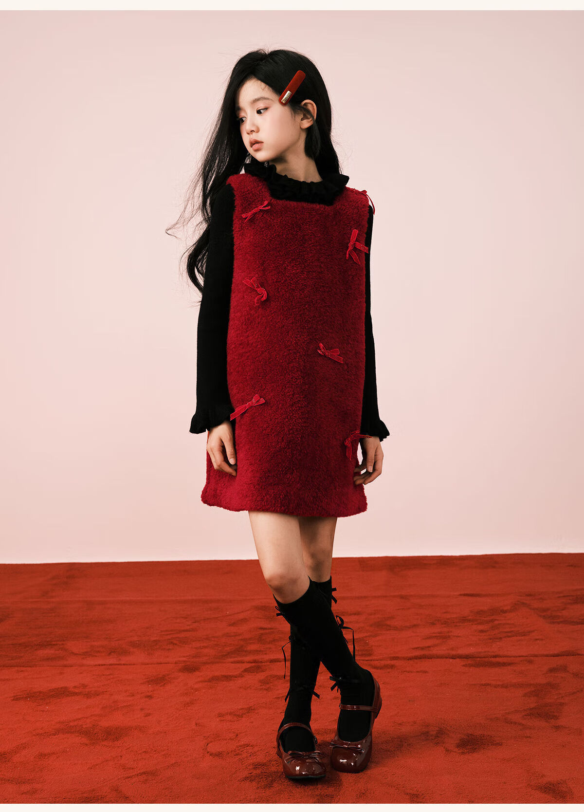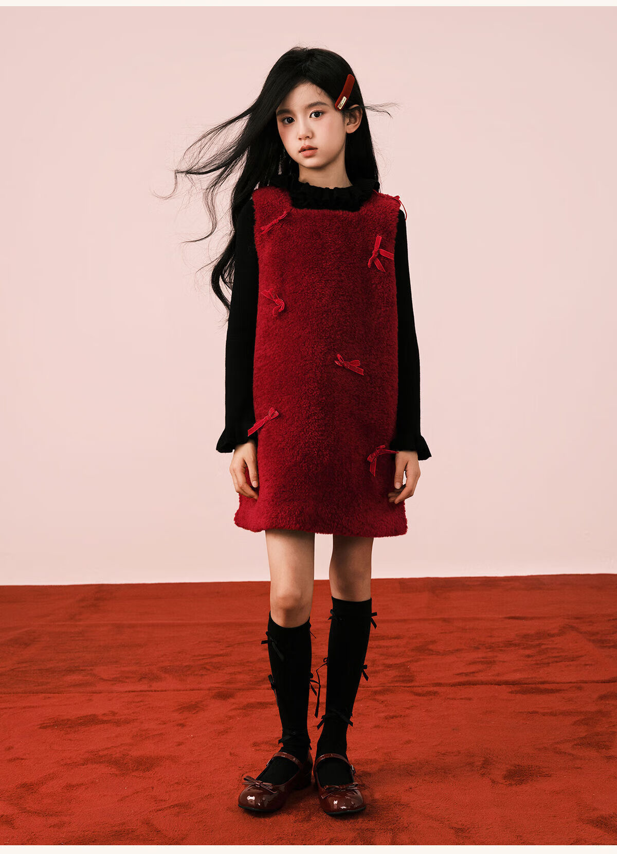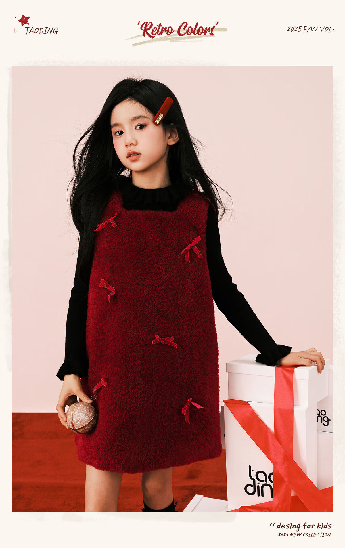 Taoding New Year Girls Dress Spring and Autumn Style Western Girl Thickened Warm Bow Fur Skirt Small Tank Top