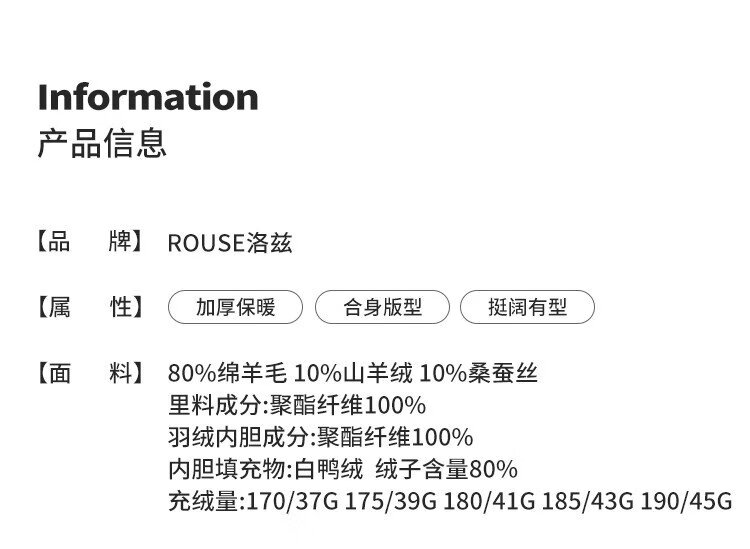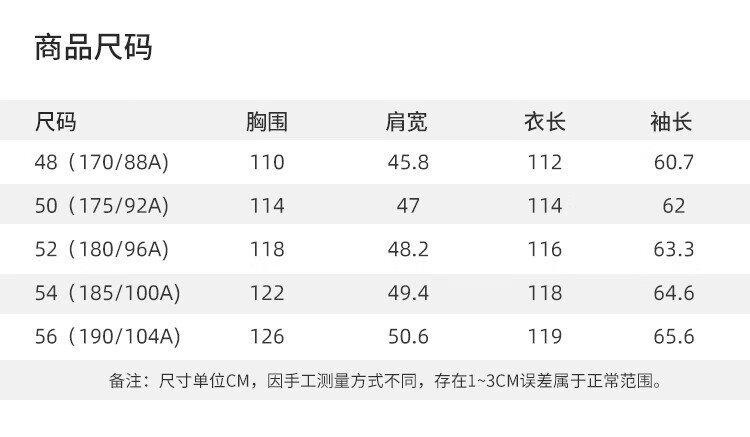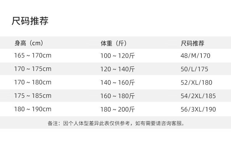 China (cm) 165 / 88-90 170 / 96-98 175 / 108-110 180 / 118-122 185 / 126-130