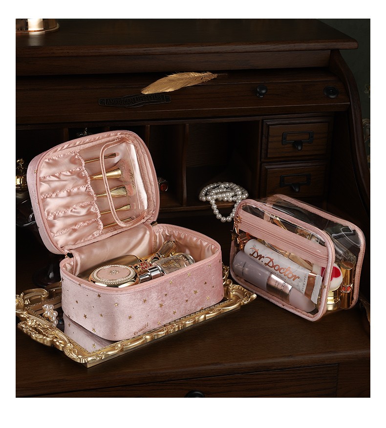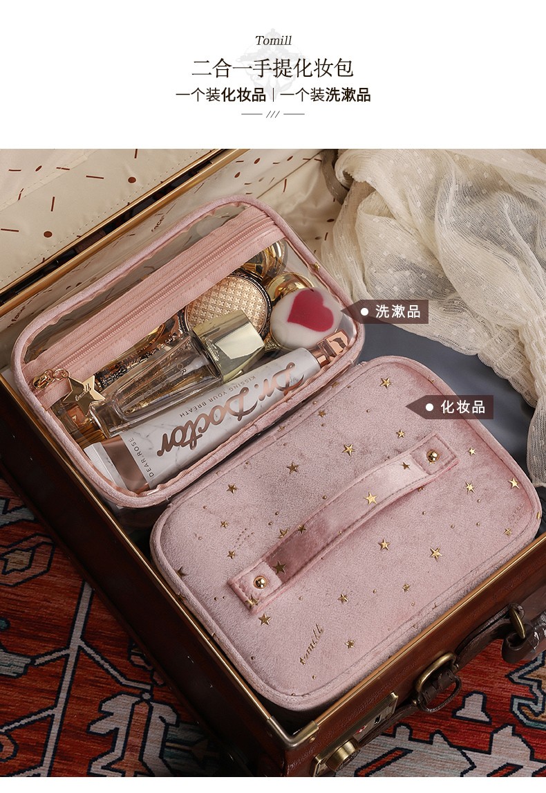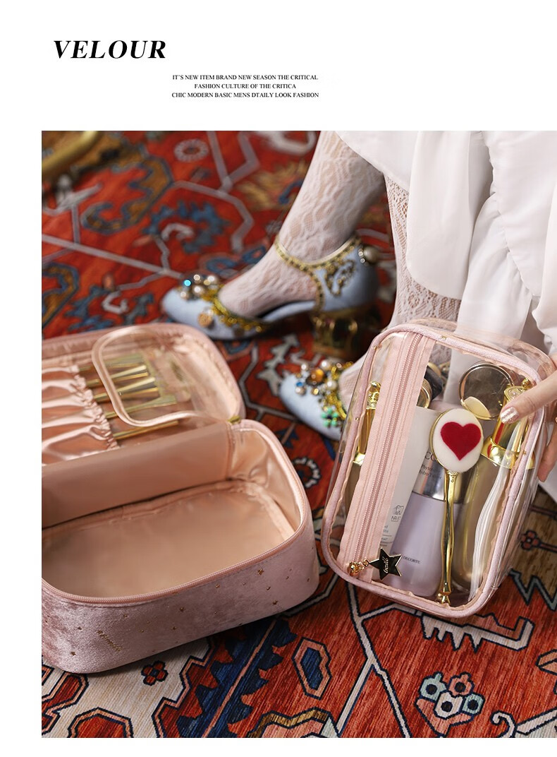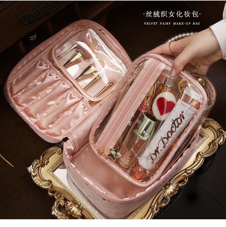 ToMill Cosmetic Bag Women's Large Capacity Skin Care Product Storage Bag Business Travel Toiletries Bag Velvet Portable Cosmetics Storage Bag Velvet Weaver-Pink + TPU Transparent Bag