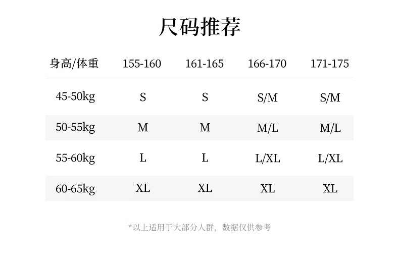 China (cm) 160-165/84-86 165-170 / 88-90 167-172 / 92-96 168-173 / 98-102 170-176 / 106-110