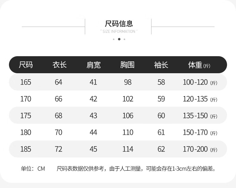 China (cm) 165 / 88-90 170 / 96-98 175 / 108-110 180 / 118-122 185 / 126-130