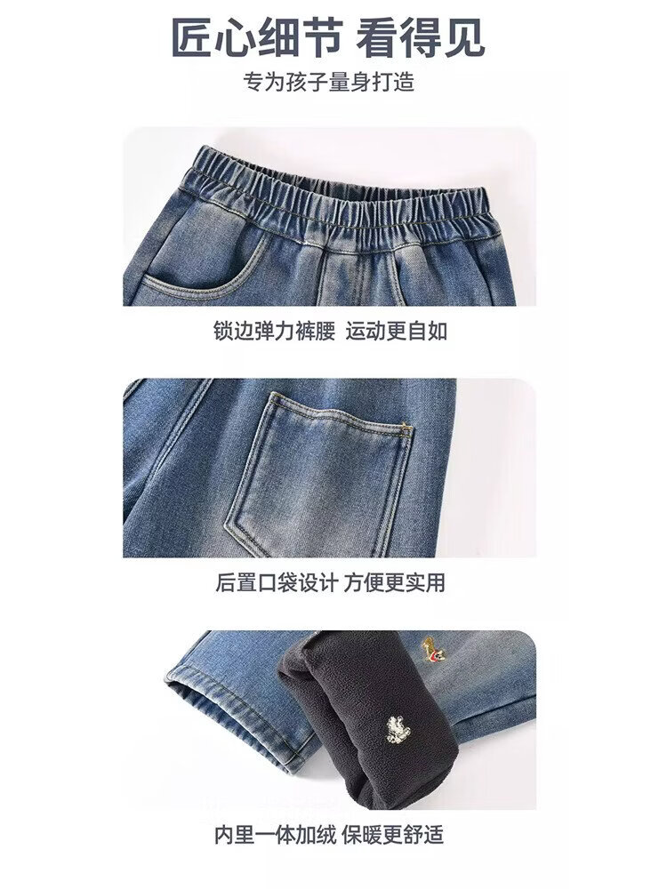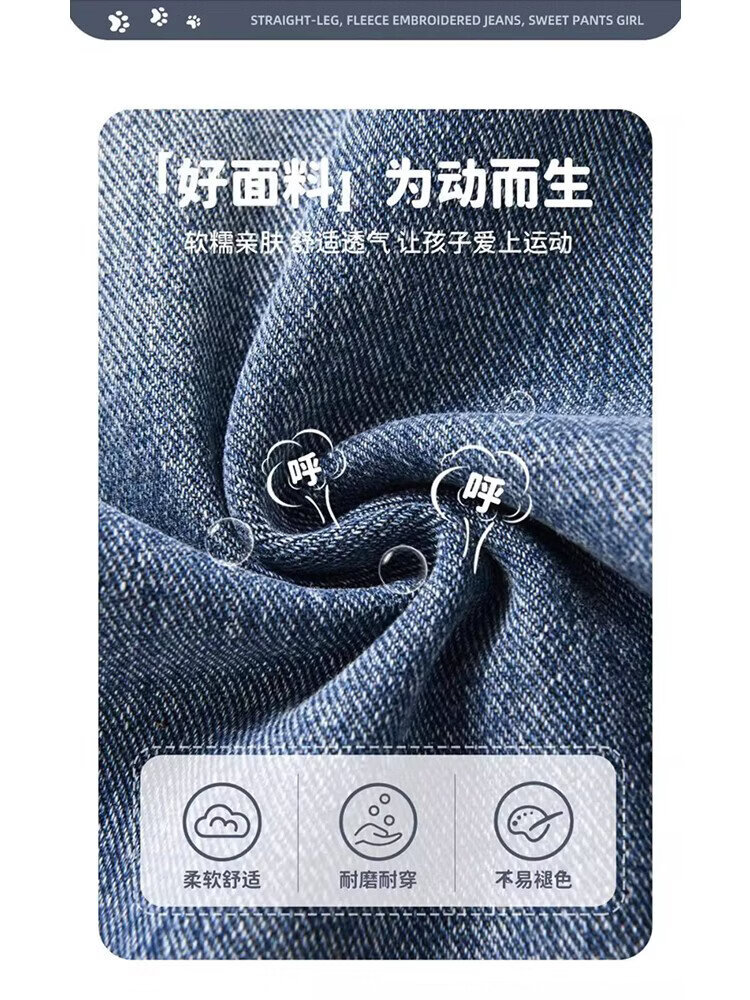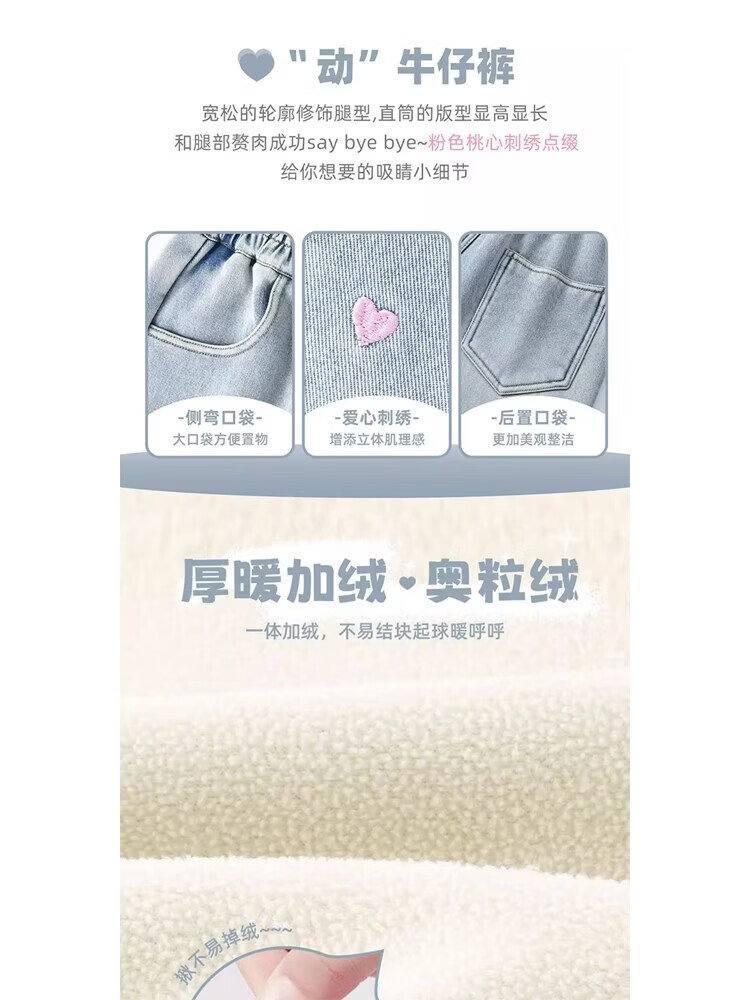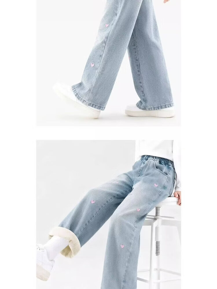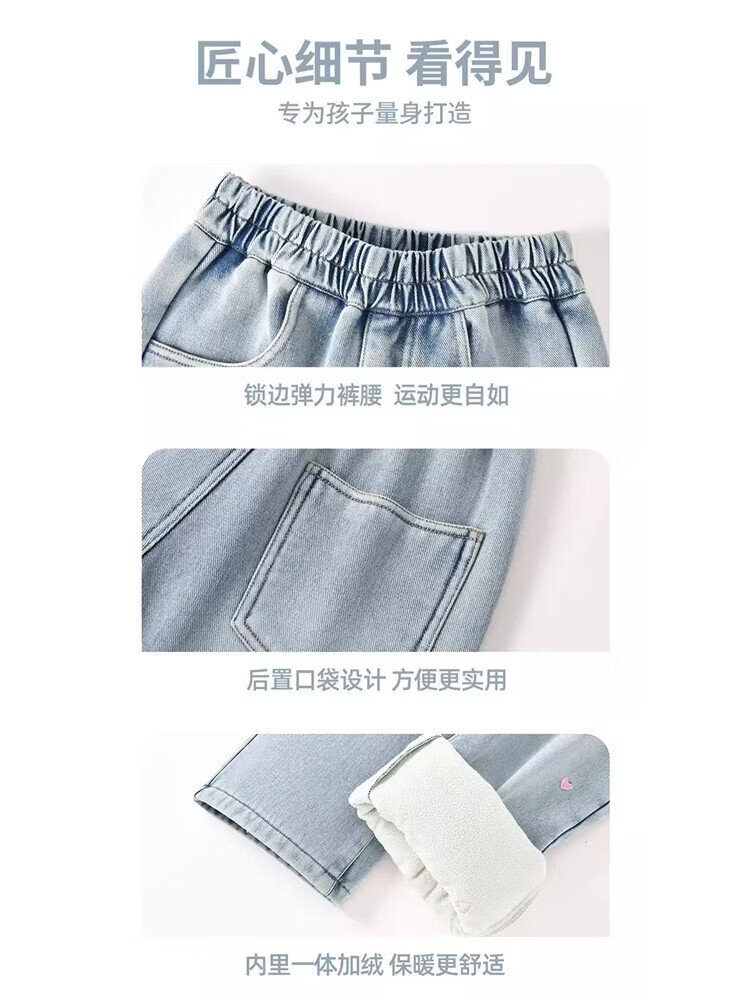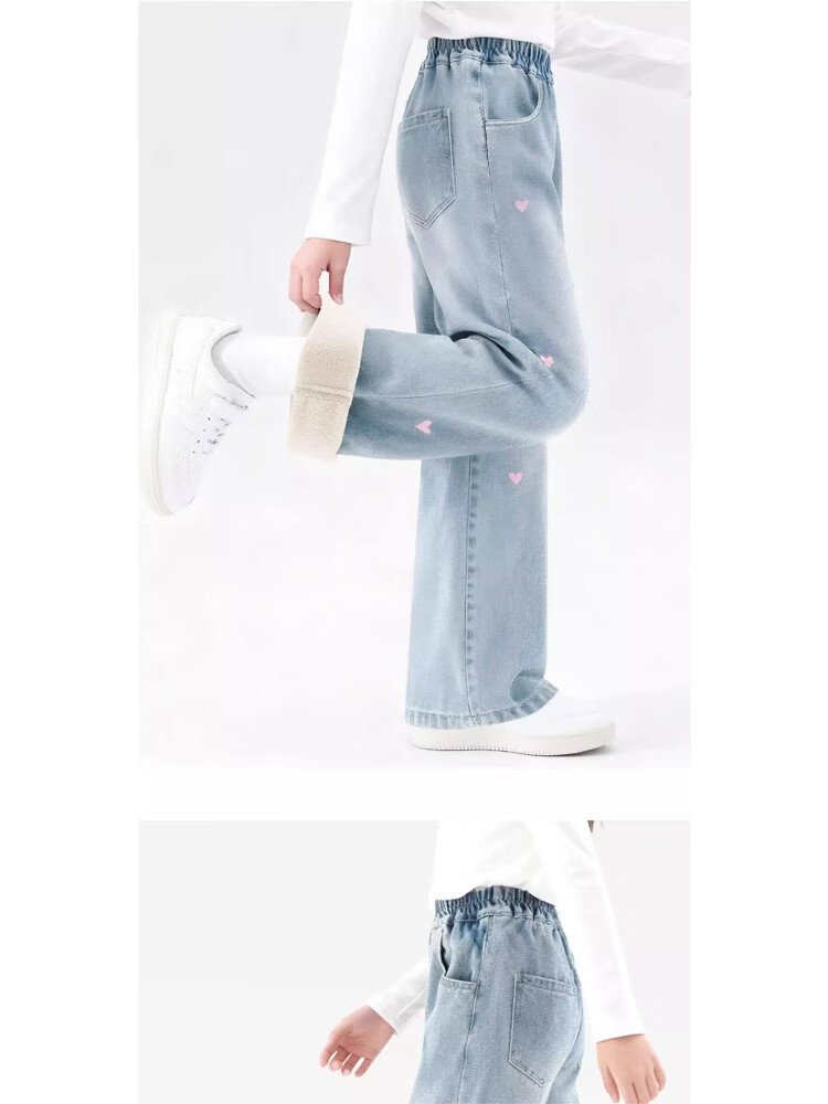 BOBDOG girls' velvet thickened pants new style girls casual jeans all-in-one velvet autumn and winter wear denim light blue 140