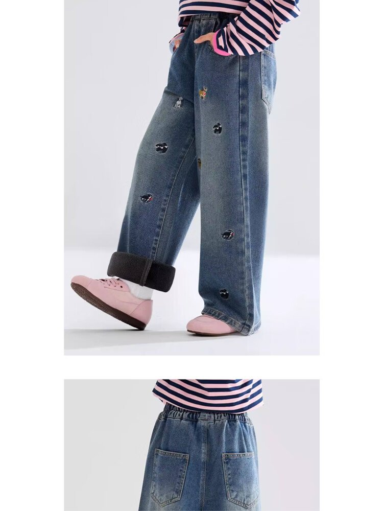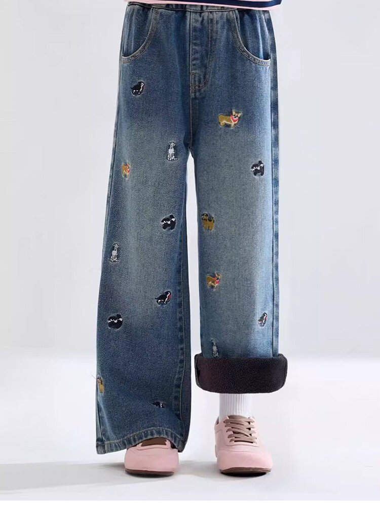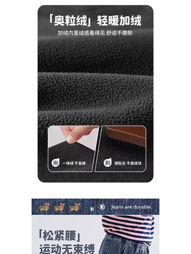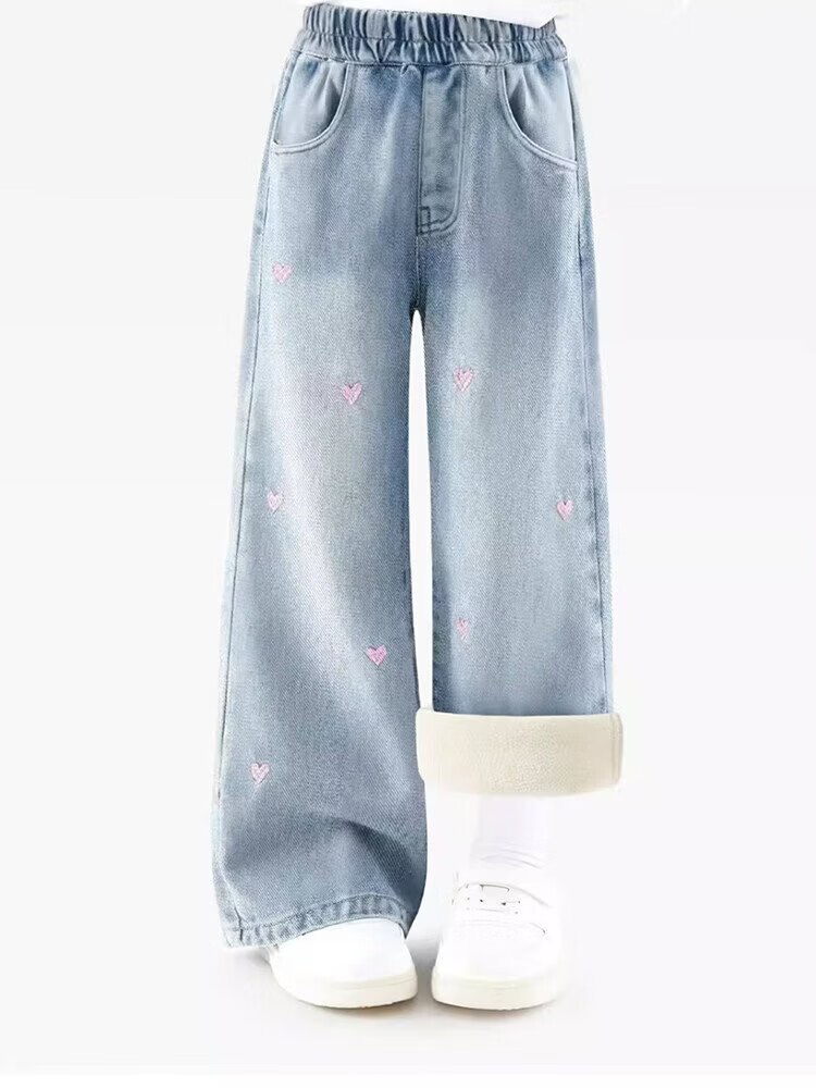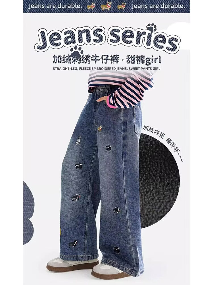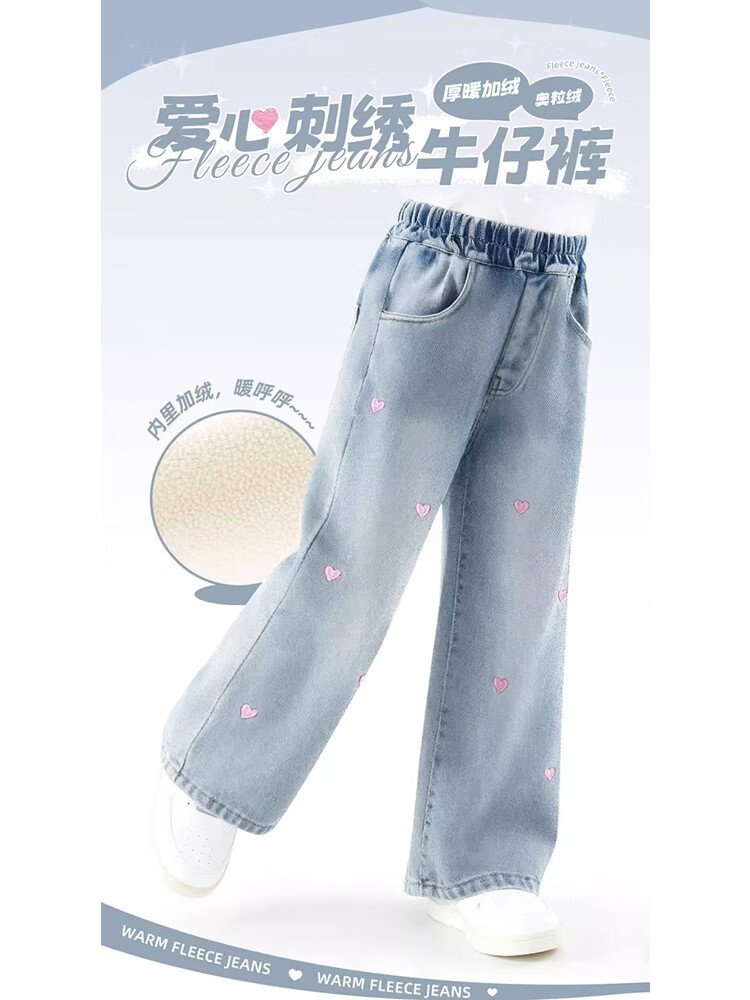BOBDOG girls' velvet thickened pants new style girls casual jeans all-in-one velvet autumn and winter wear denim light blue 140