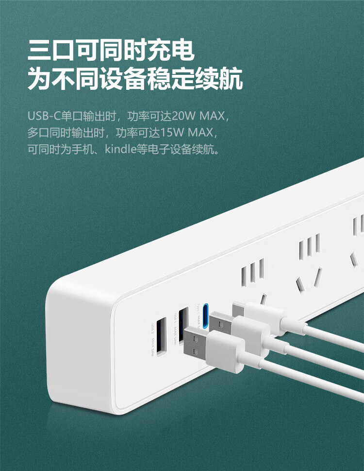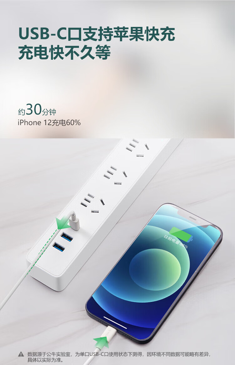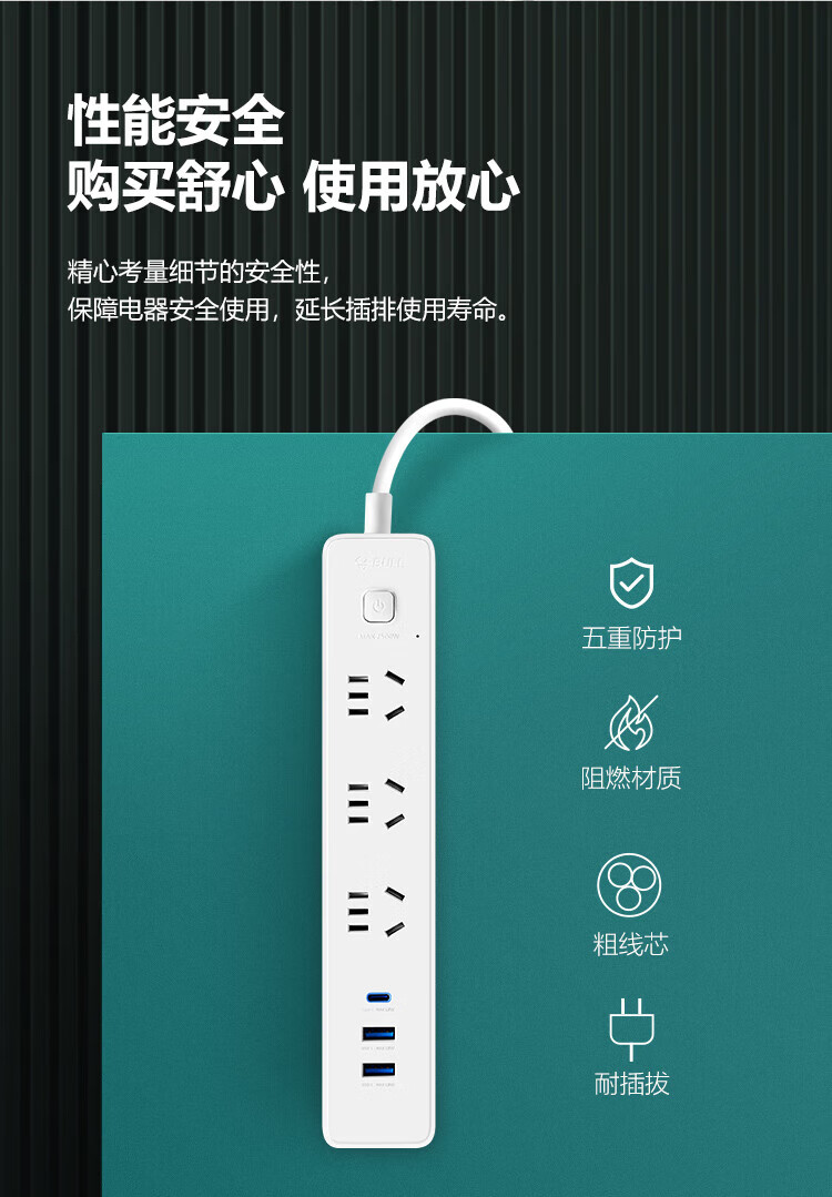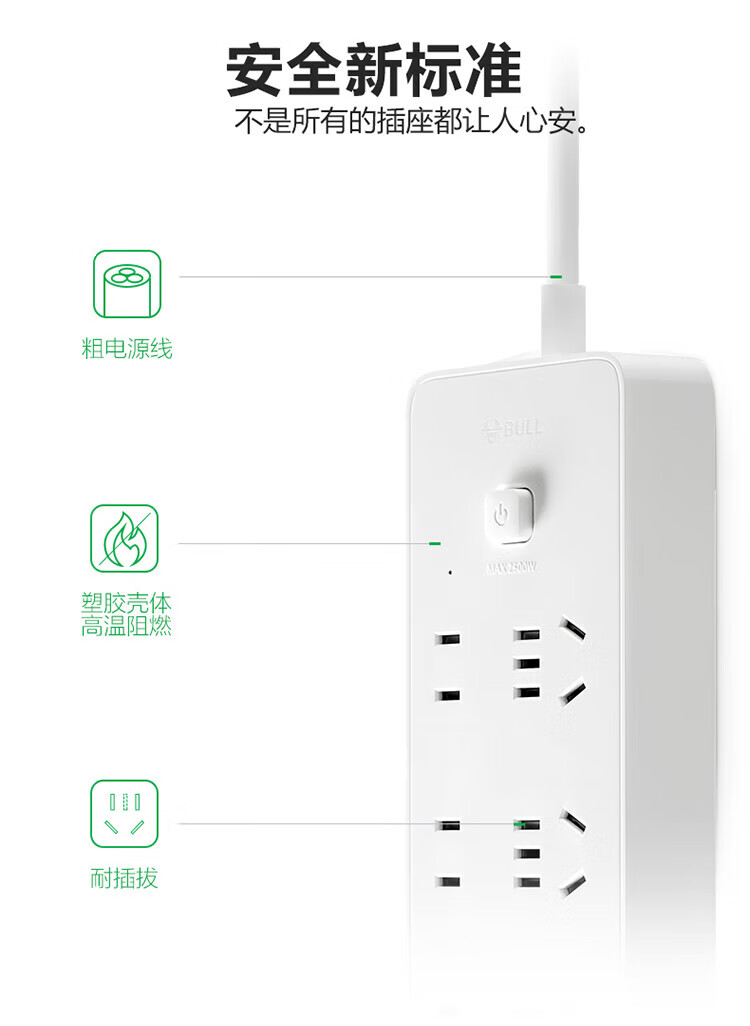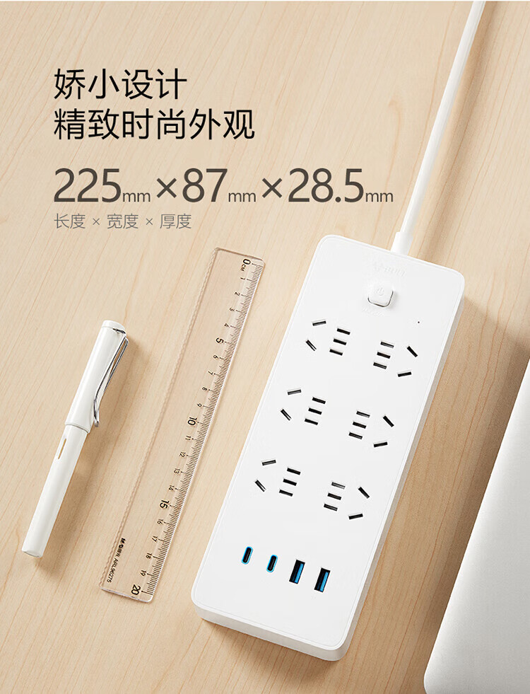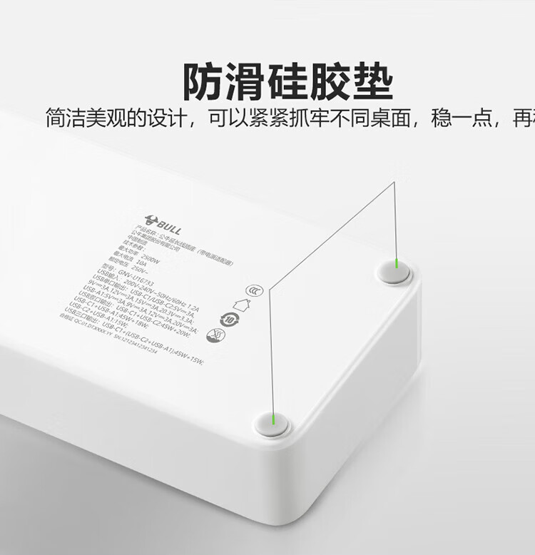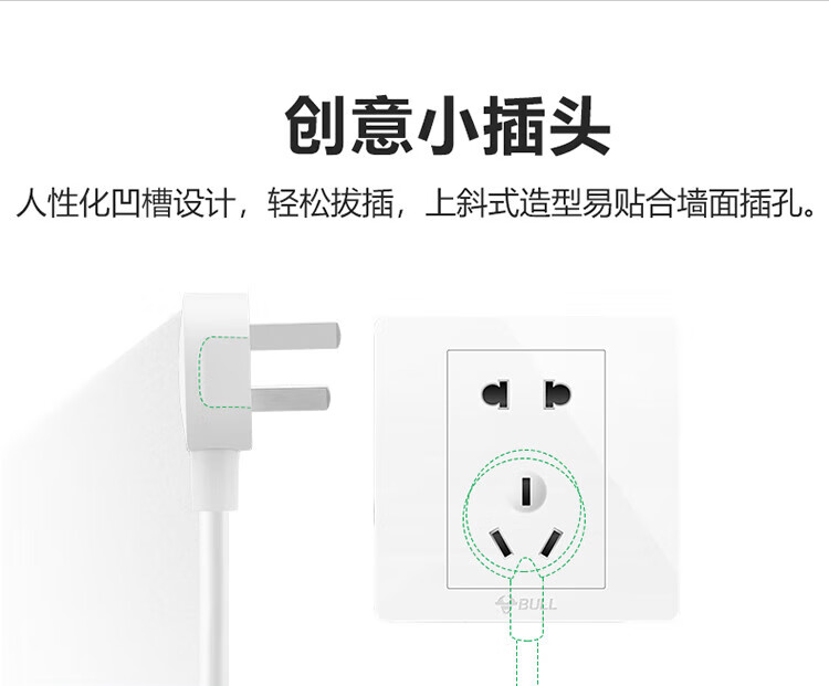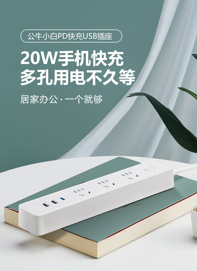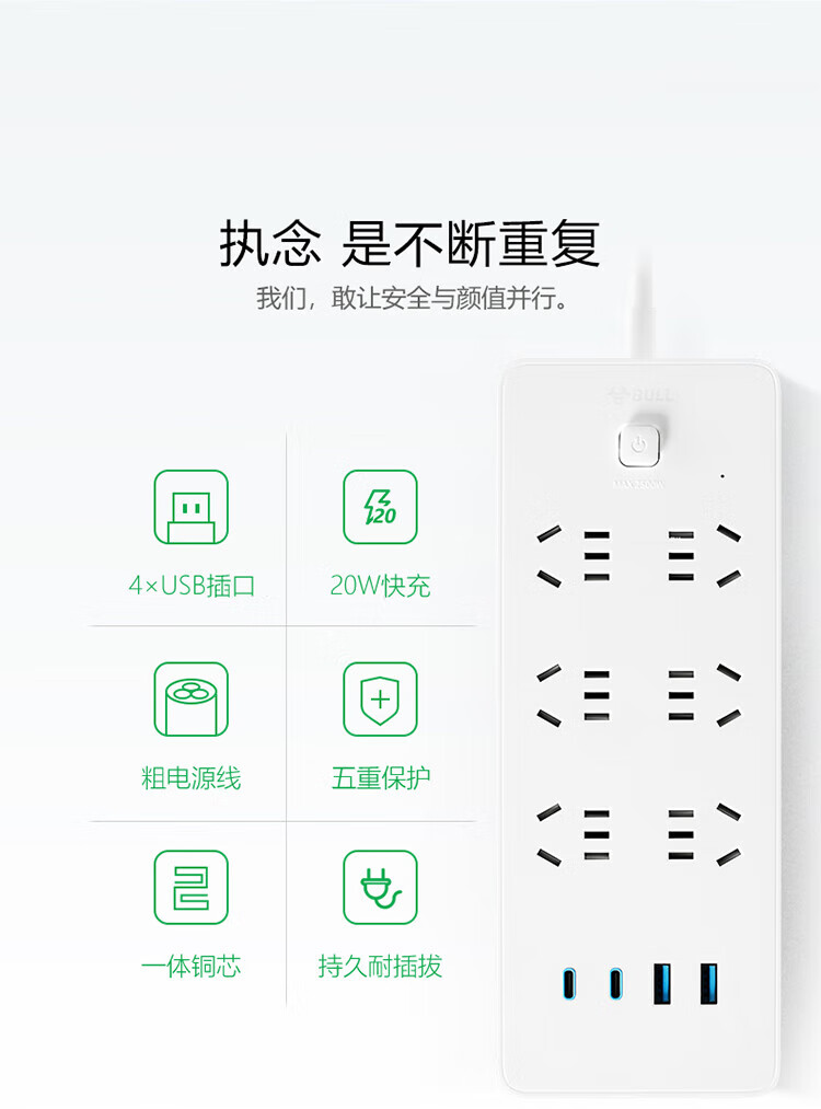 BULL Xiaobai Fast Charging Series Socket Converter Smart USB TYPE-C Port Terminal Board Socket Strip 20W Fast Charging | Six Positions and Five Holes | 1.8 Meters U1206