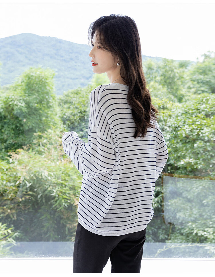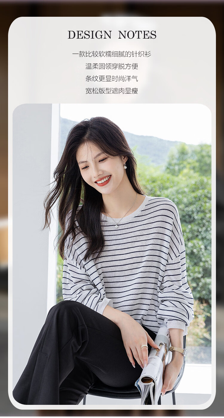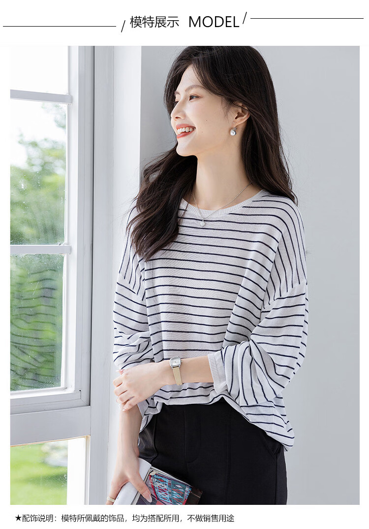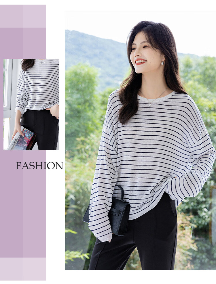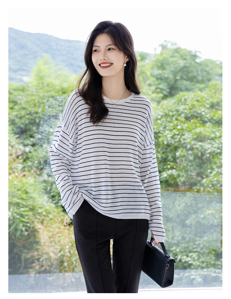 Ives (ITISF4) chic lazy style long-sleeved T-shirt Korean striped loose slim casual top white one size