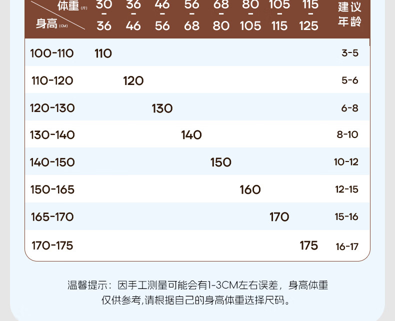 China (cm) 165 / 88-90 170 / 96-98 175 / 108-110 180 / 118-122 185 / 126-130