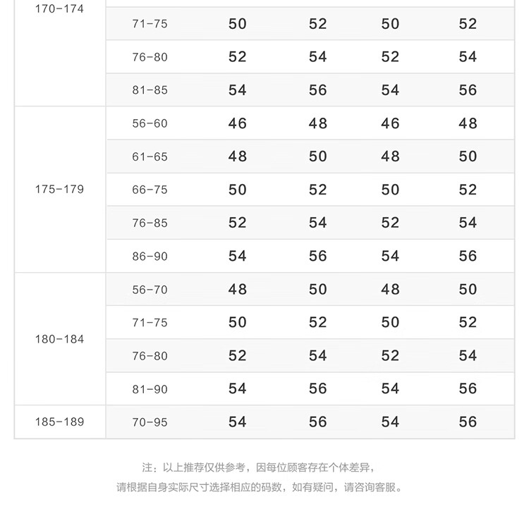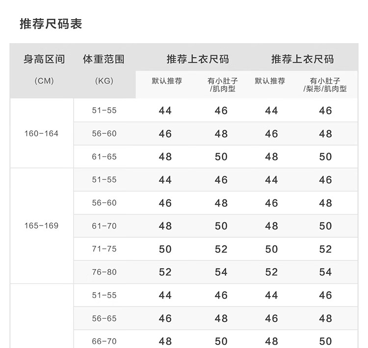 China (cm) 160-165/84-86 165-170 / 88-90 167-172 / 92-96 168-173 / 98-102 170-176 / 106-110
