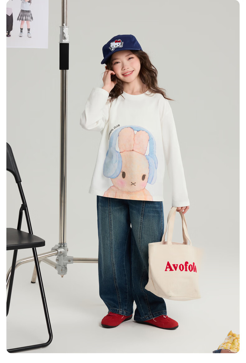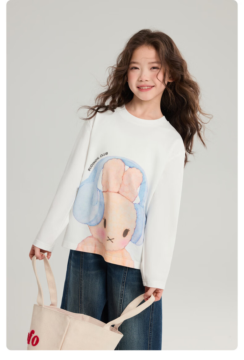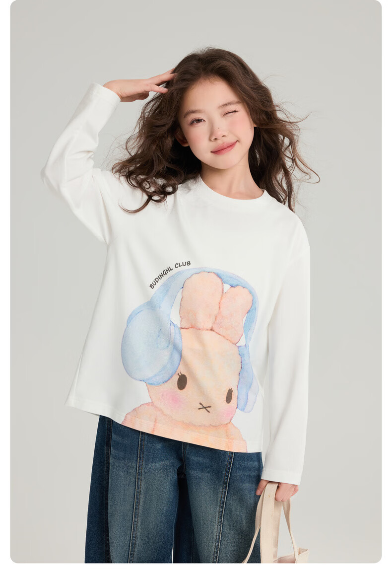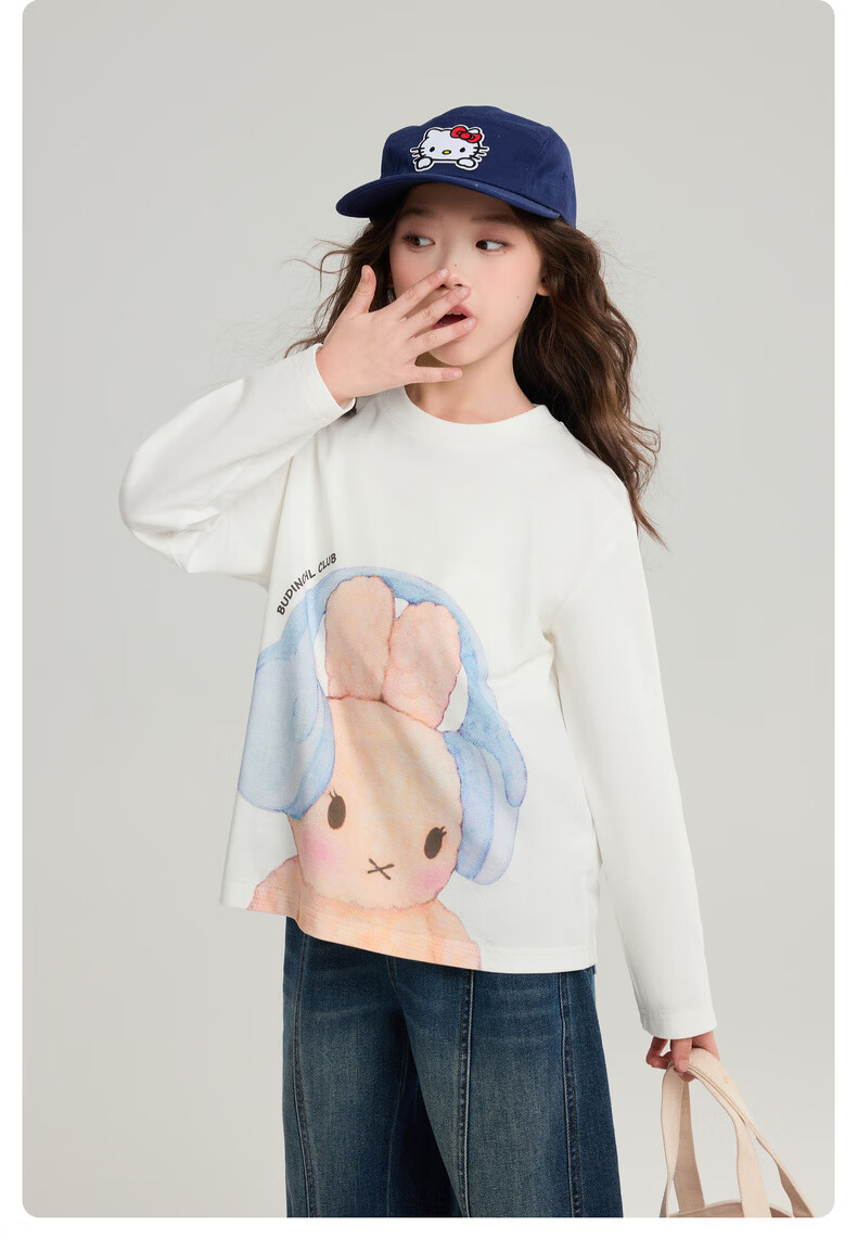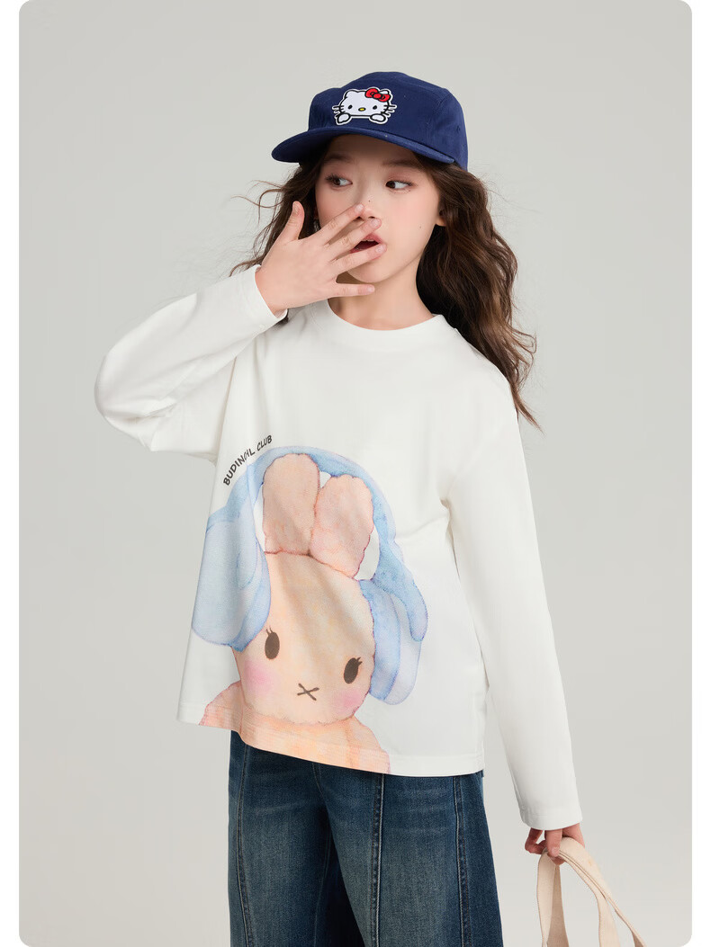 Pudding Haru Music Rabbit Girls Cute Cartoon Print T-shirt Spring New Product Loose and Comfortable Long Sleeve T-shirt for Middle and Large Children