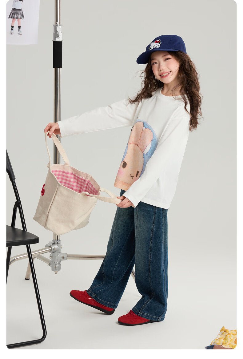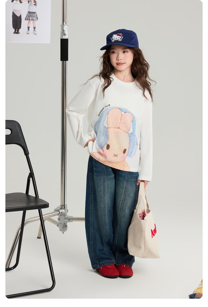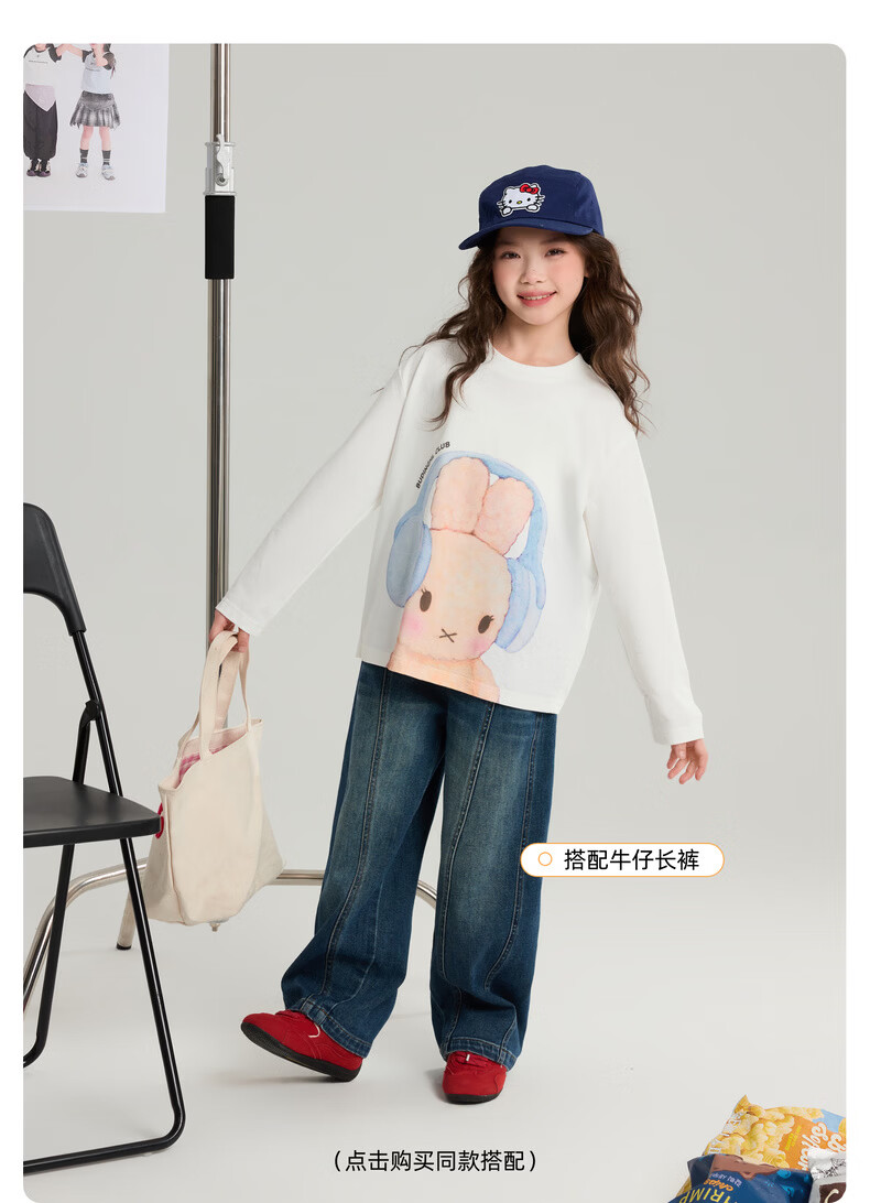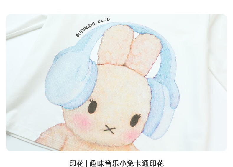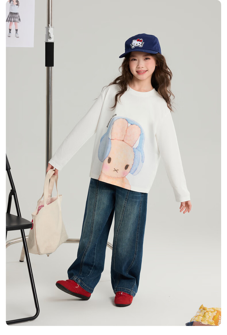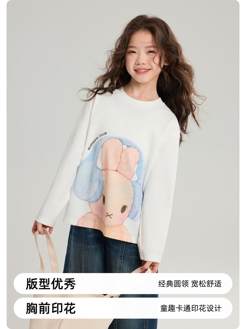Pudding Haru Music Rabbit Girls Cute Cartoon Print T-shirt Spring New Product Loose and Comfortable Long Sleeve T-shirt for Middle and Large Children