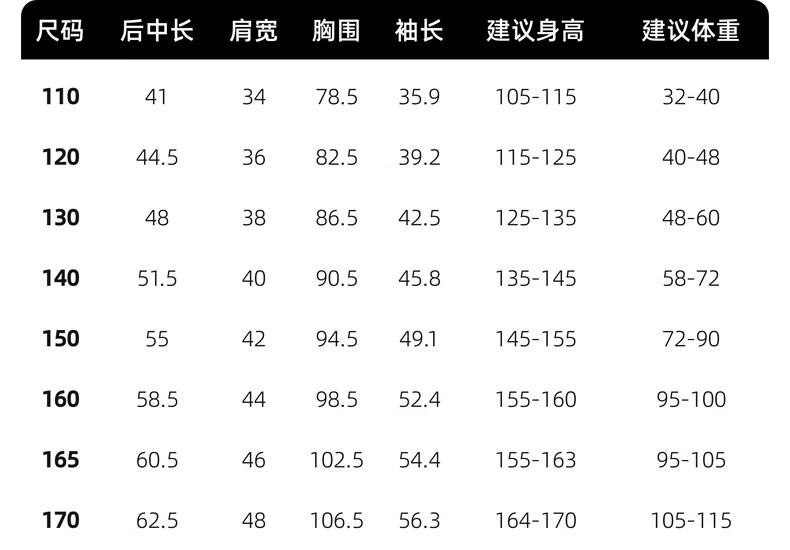 China (cm) 160-165/84-86 165-170 / 88-90 167-172 / 92-96 168-173 / 98-102 170-176 / 106-110