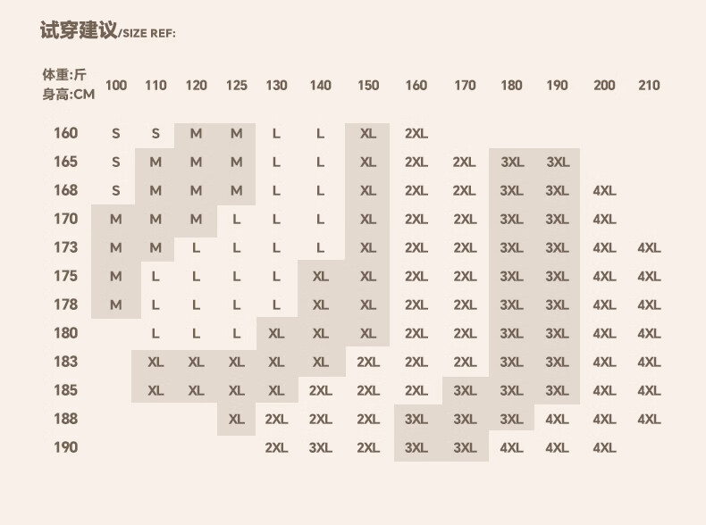 China (cm) 160-165/84-86 165-170 / 88-90 167-172 / 92-96 168-173 / 98-102 170-176 / 106-110