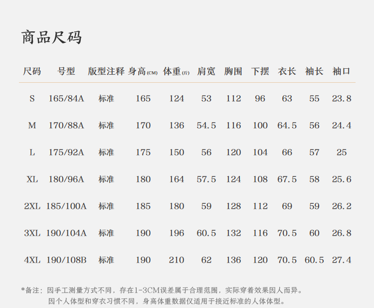 China (cm) 165 / 88-90 170 / 96-98 175 / 108-110 180 / 118-122 185 / 126-130