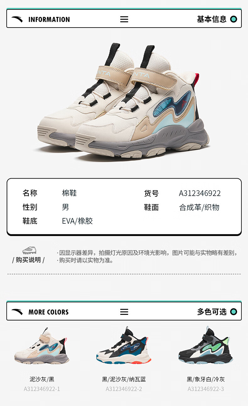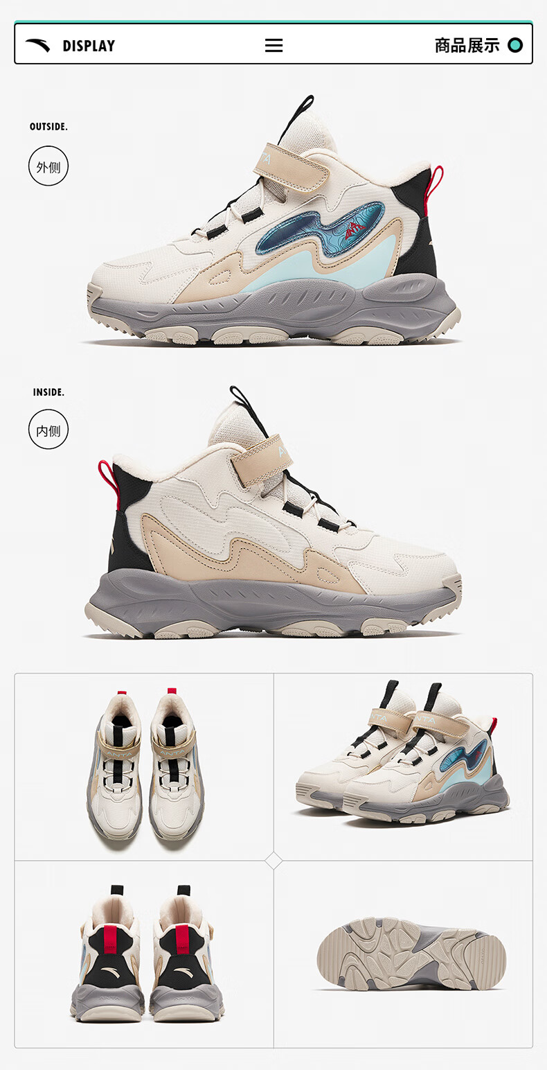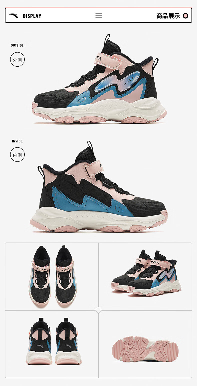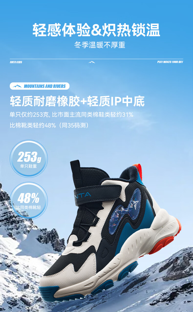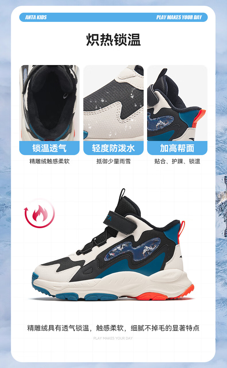 Anta children's cotton shoes winter shoes short boots plus velvet boys snow boots cotton boots big children's sports shoes A312346922J