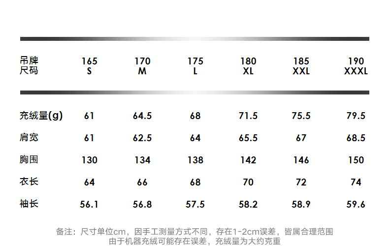 China (cm) 165 / 88-90 170 / 96-98 175 / 108-110 180 / 118-122 185 / 126-130
