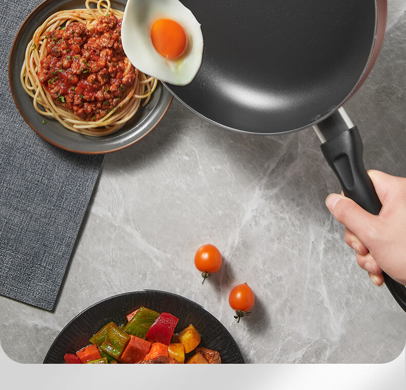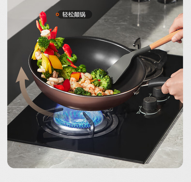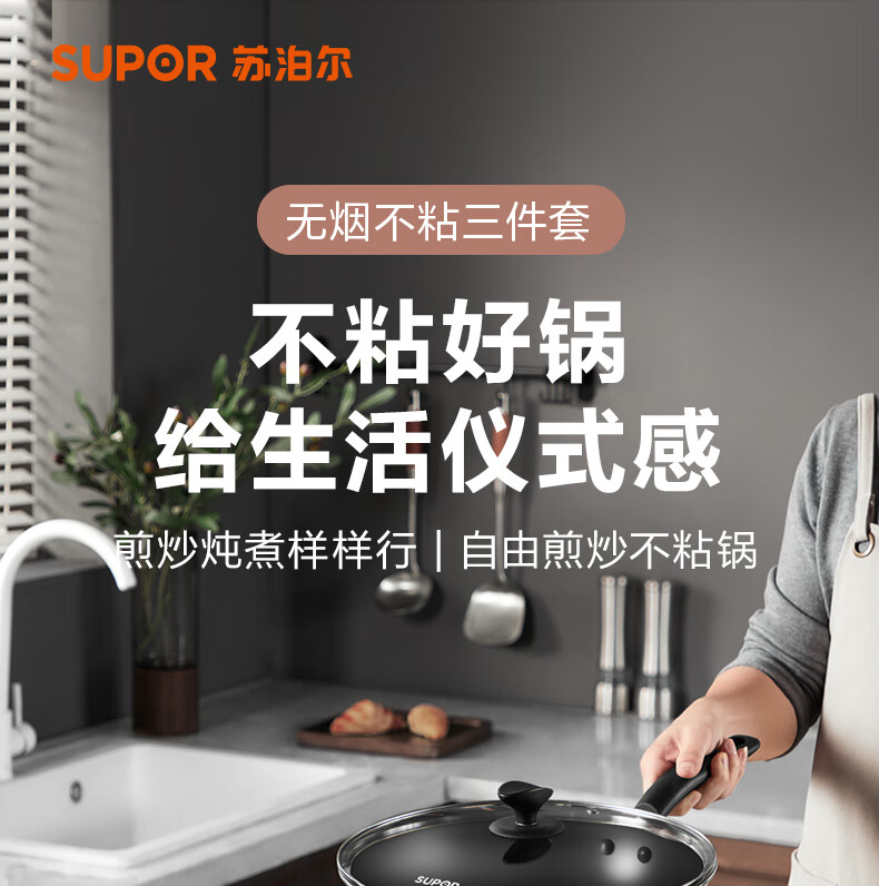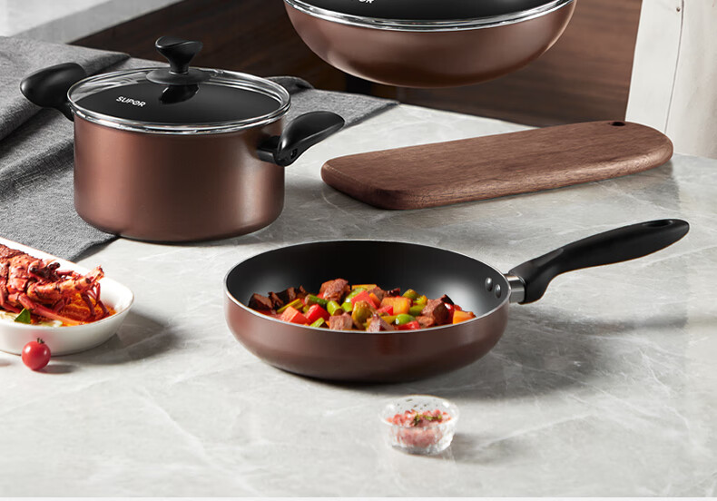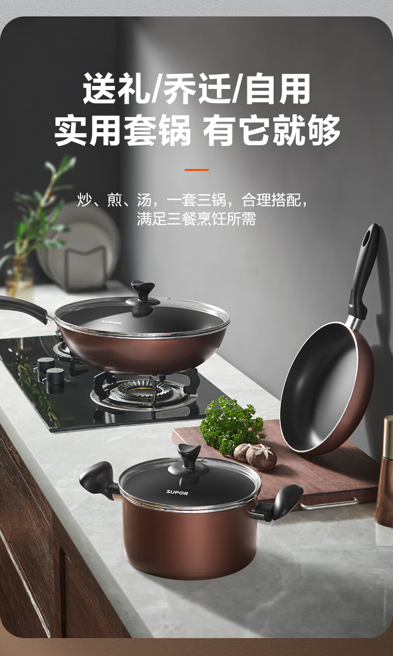 SUPOR pot set, non-stick pot, frying pan, frying pan, milk pot, household three-piece set, universal for gas induction cooker, bright brown three-piece set, frying soup + silicone spatula
