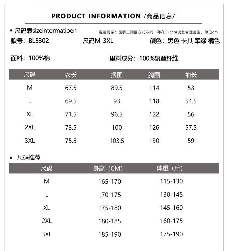 China (cm) 165 / 88-90 170 / 96-98 175 / 108-110 180 / 118-122 185 / 126-130