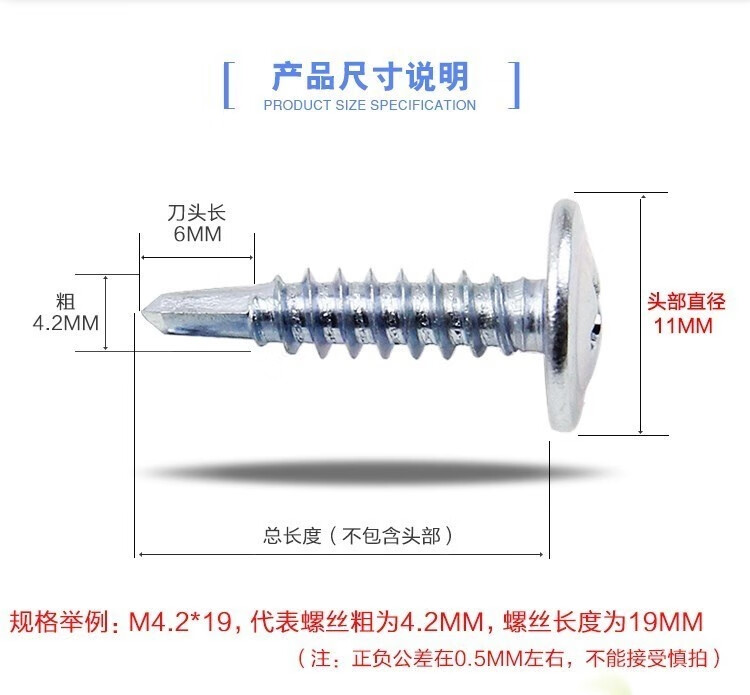 Flat head thick screw large head self-tapping dovetail round head drill tail screw flat head cross countersunk head self-tapping drill nail galvanized blue and white zinc M4.2*13 500 pieces