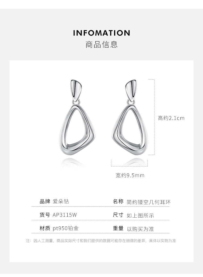 Aido Diamond PT950 Platinum Geometric Stud Earrings for Women Platinum Fashion Hollow Glossy Triangular Earrings Pair 2.9-3.1g + Delivery Certificate