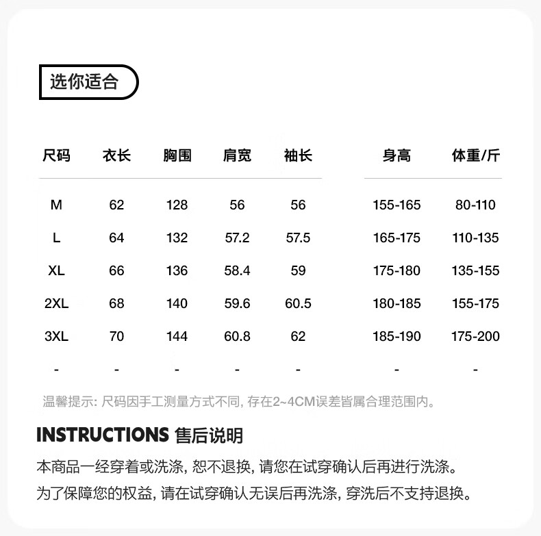 China (cm) 165 / 88-90 170 / 96-98 175 / 108-110 180 / 118-122 185 / 126-130