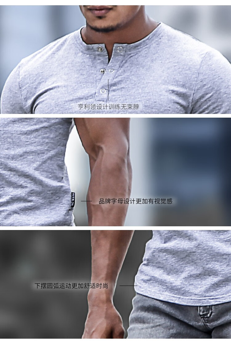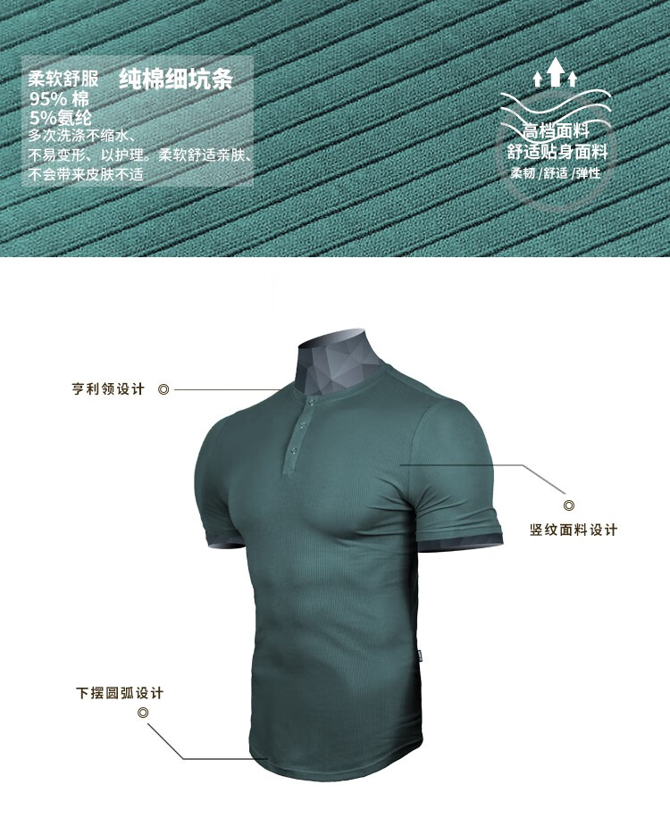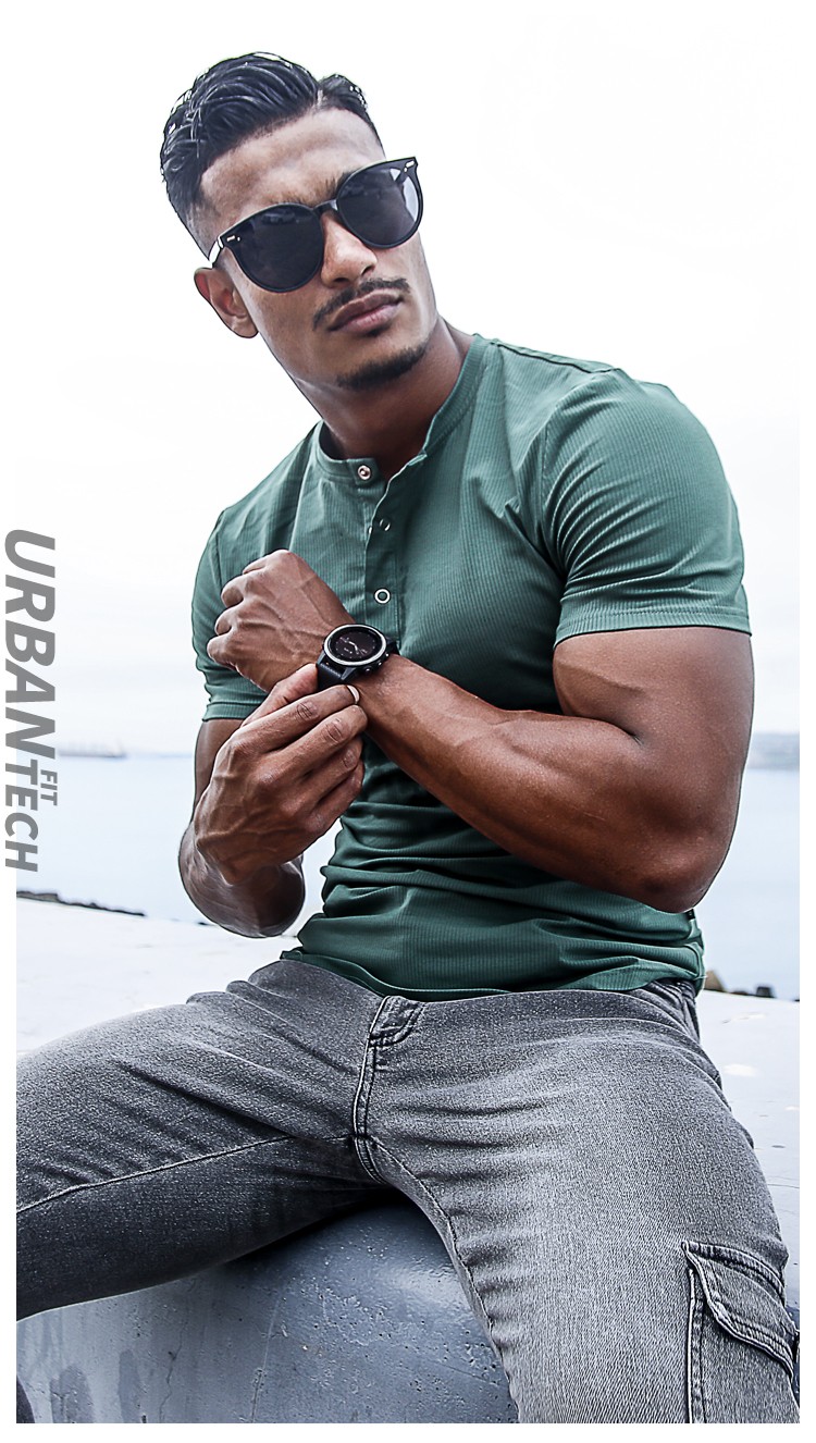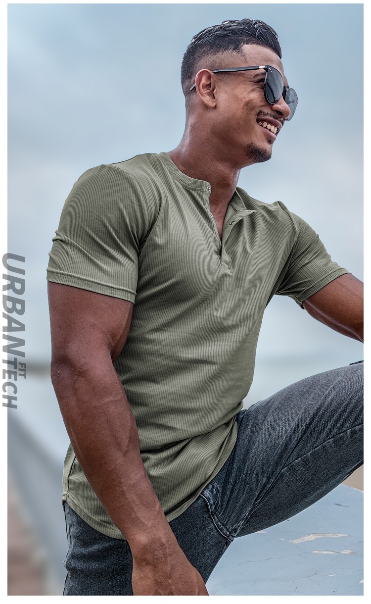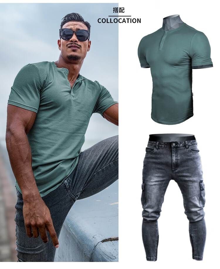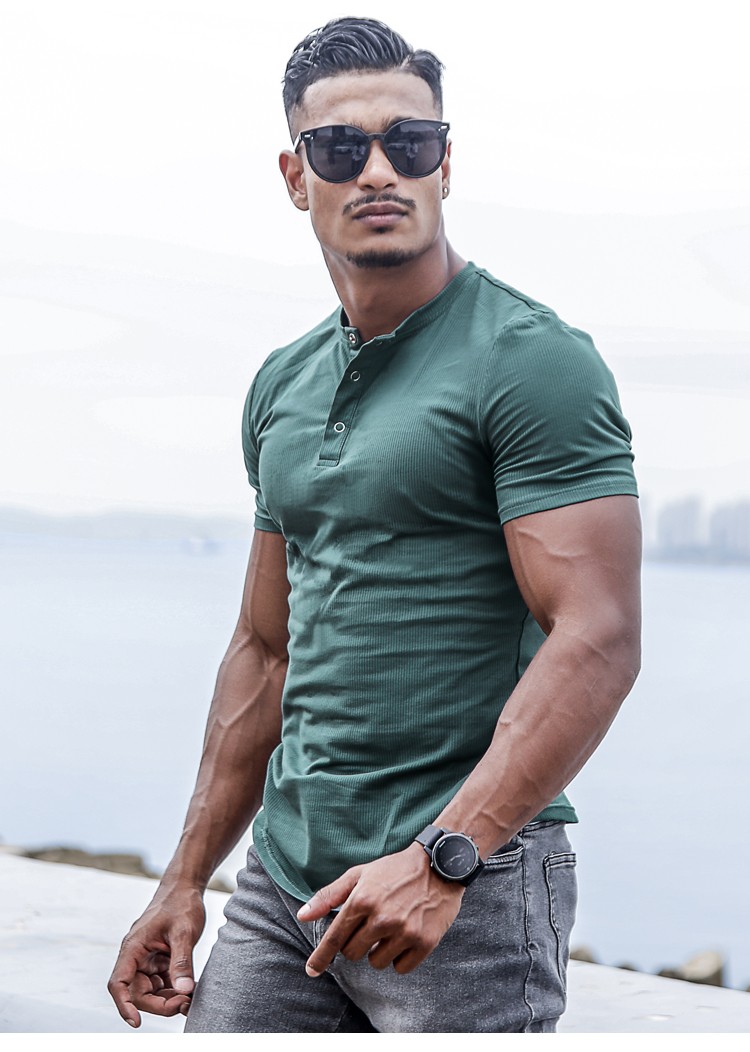 BensonVision sports short-sleeved fitness training t-shirt running casual top solid color slim fit Henry collar bottoming shirt men's summer grass green S